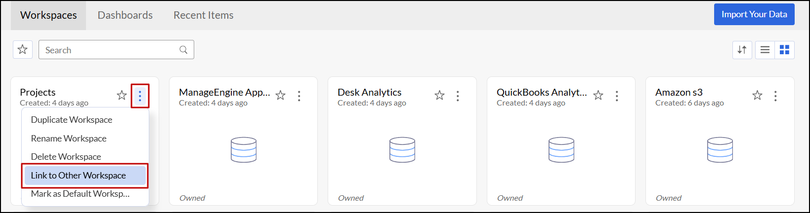 - From the Zoho Analytics home page, select a workspace to act as a primary workspace.