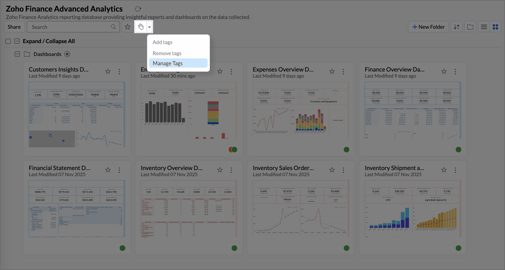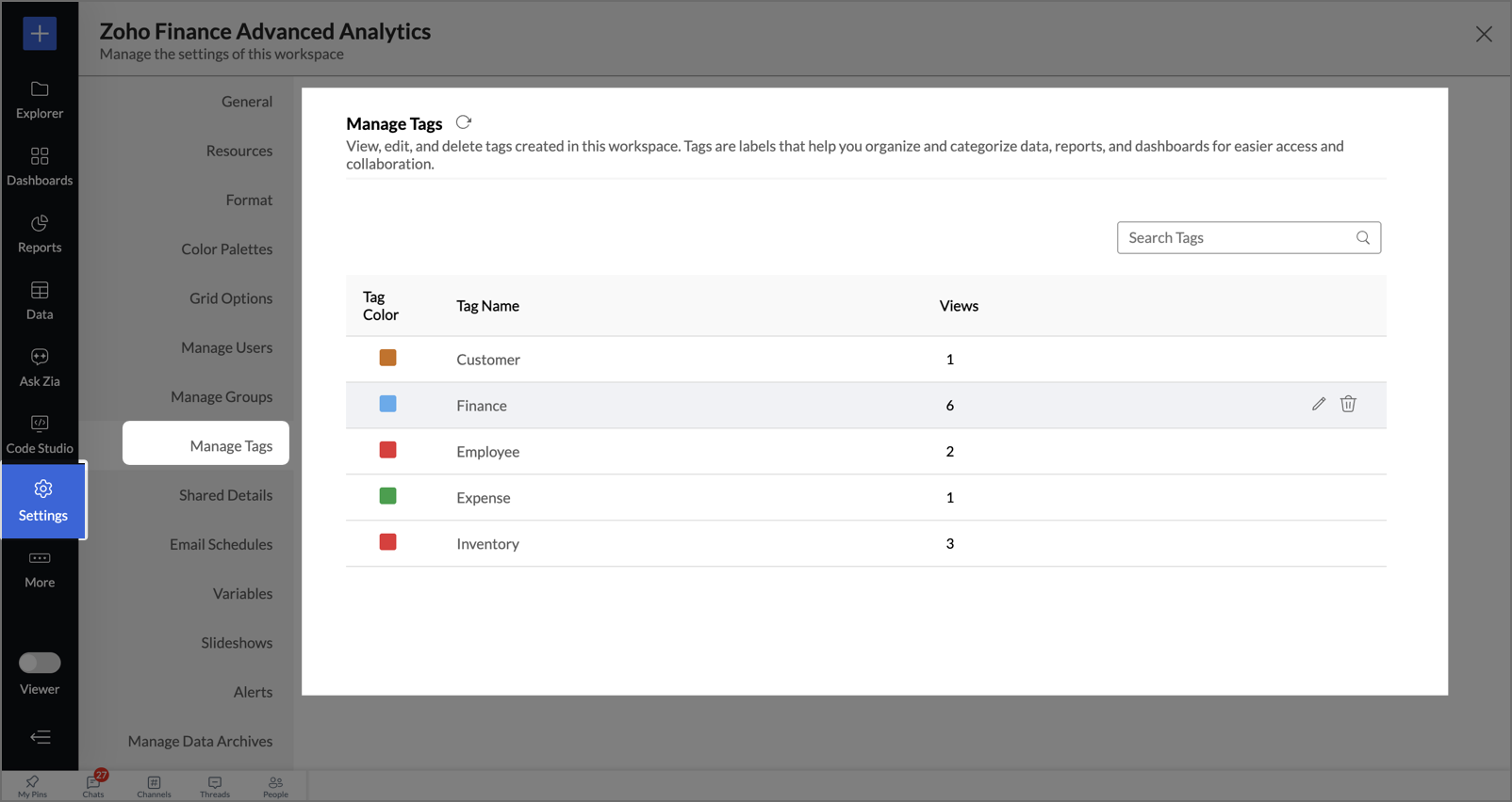 Zoho Analytics provides a centralized Manage Tags section that allows you to control all tags within a workspace from a single location, rather than editing views individually.