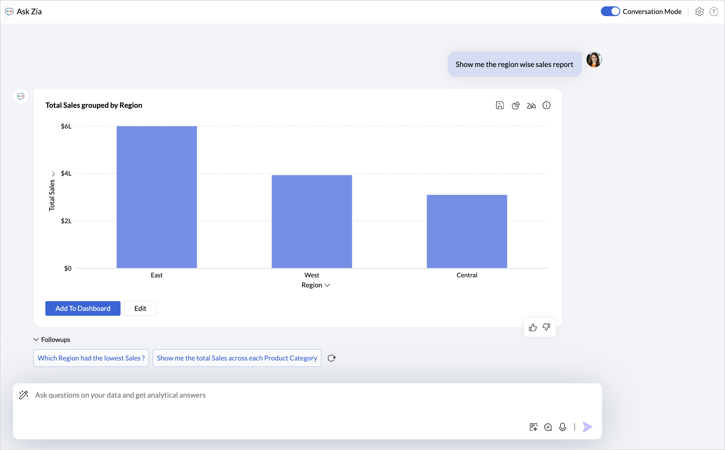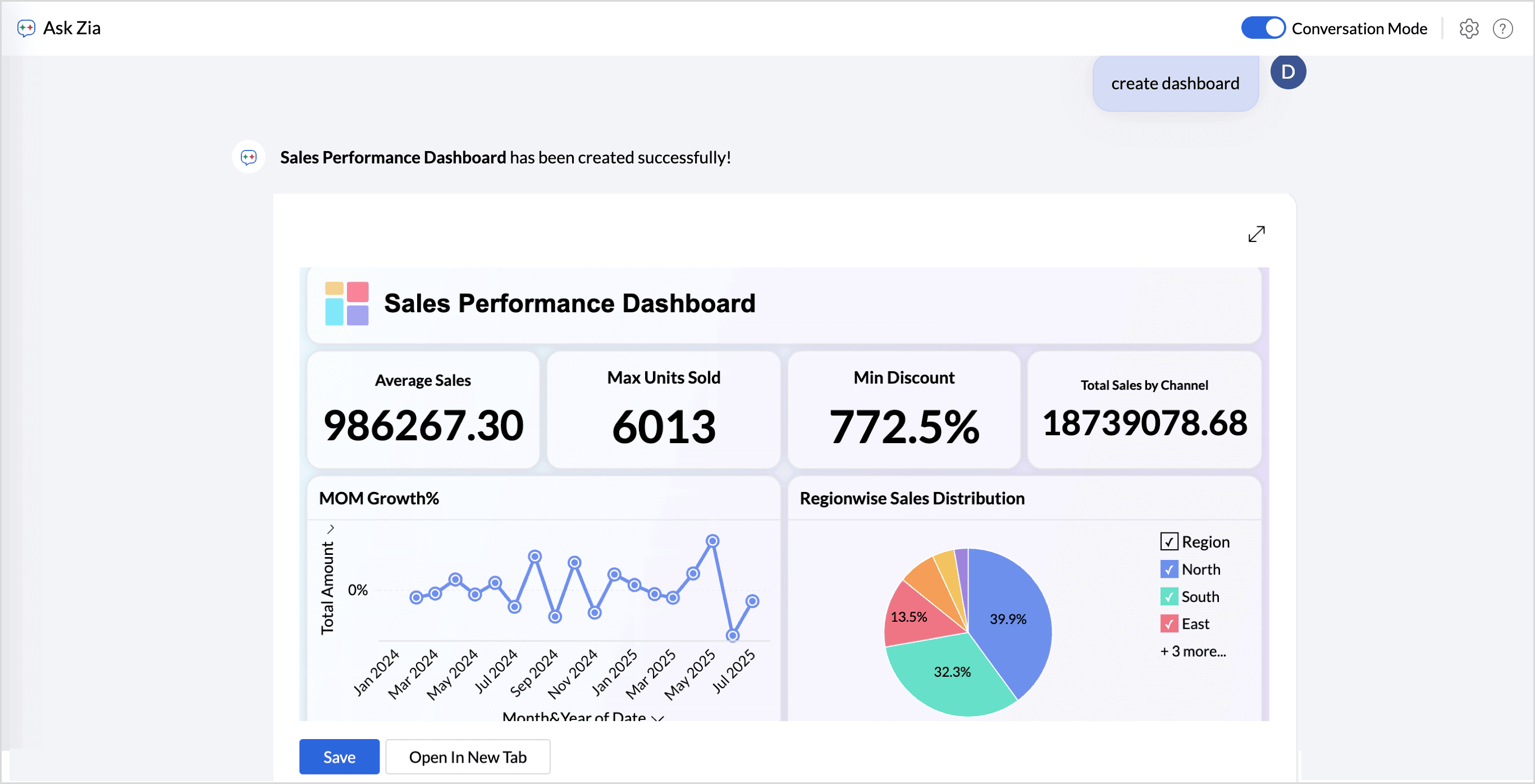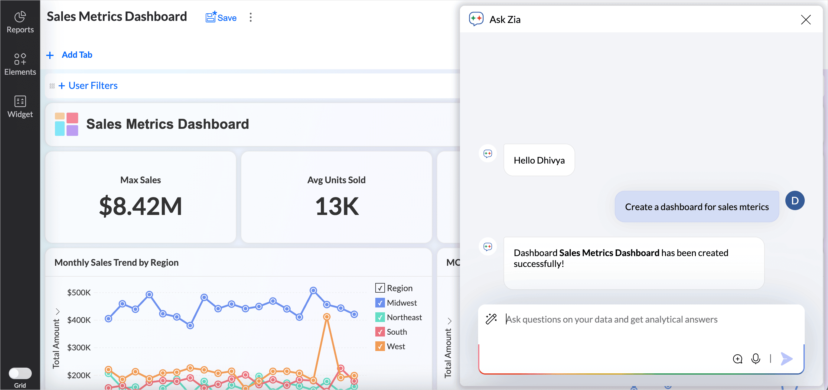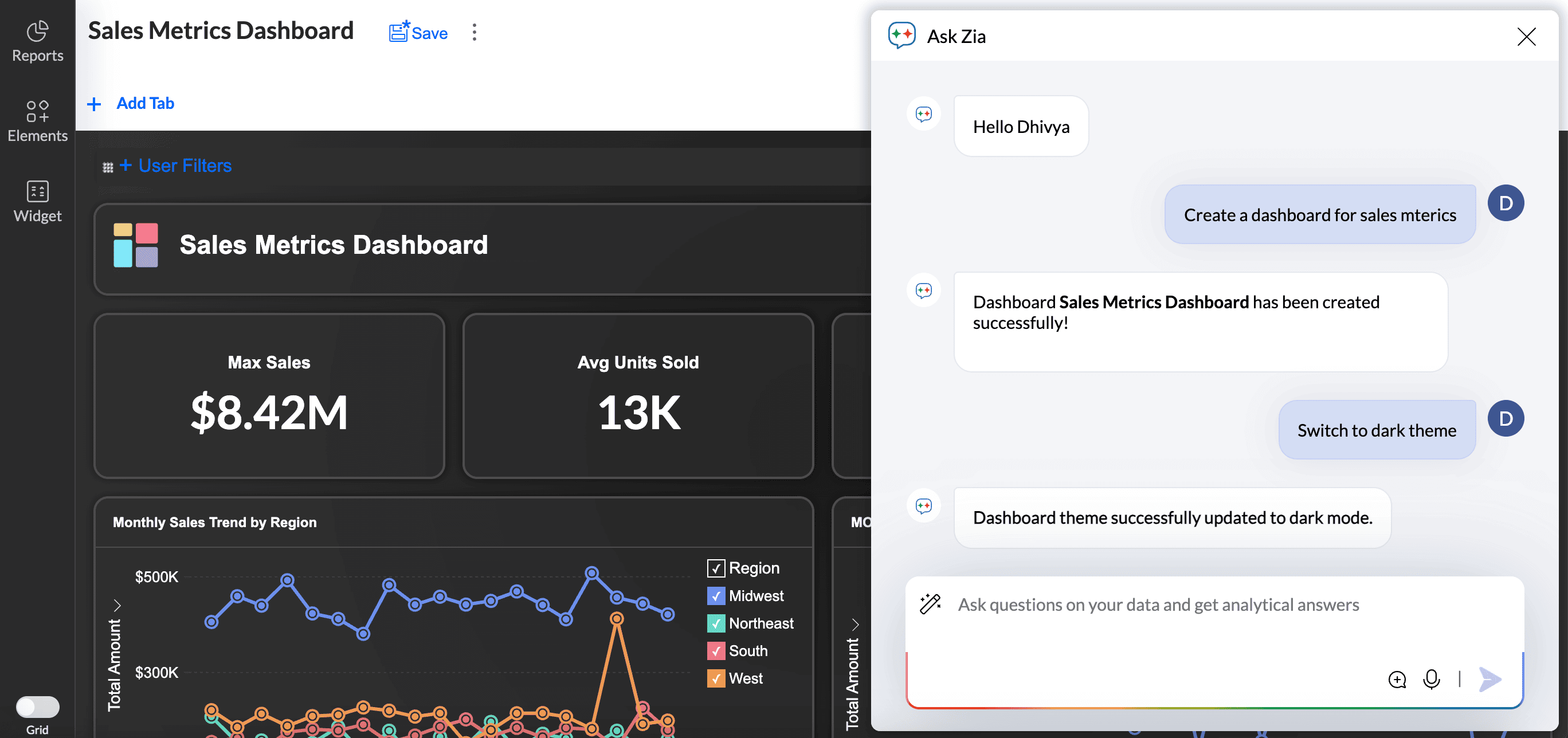 Whether you’re building dashboards from scratch or enhancing existing dashboards, Ask Zia understands your layout preferences, content needs, and visual goals and delivers a personalized experience every step of the way.