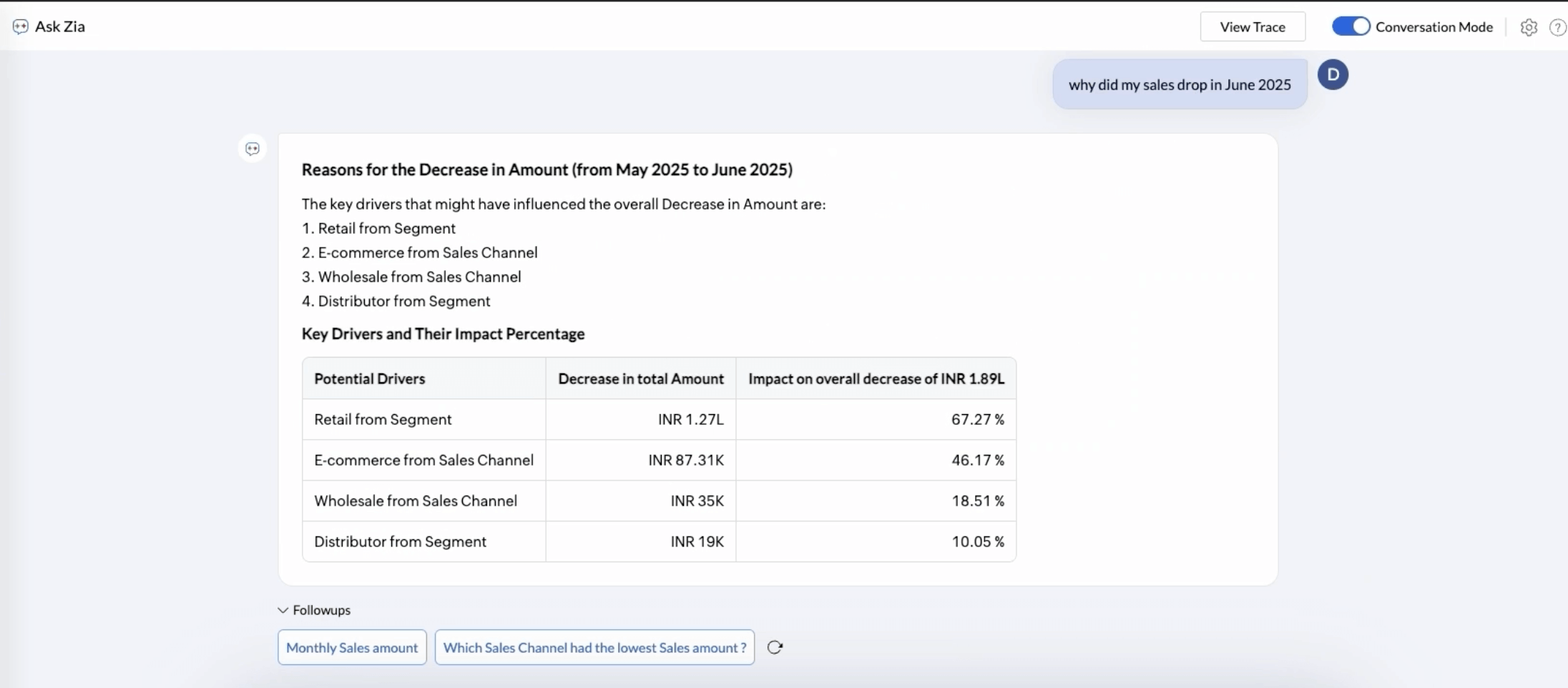 Ask Zia - Agentic AI simplifies the report and dashboard creation process. Data analysts and business users don't have to sift through many reports to understand the key insights. Ask Zia provides contextual insights that not only explain what is happening in your data but also highlight the underlying reasons behind those trends and anomalies.