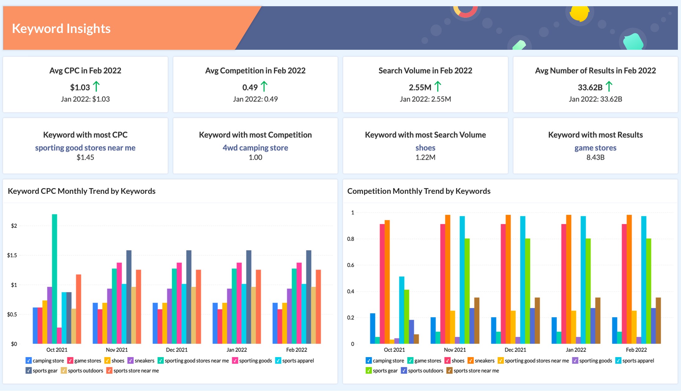 Zoho Analytics enables you to analyze your Semrush data easily. It lets you slice and dice your Semrush data the way you like and create reports & dashboards. You can analyze your search volume, compare your domain authority with competitors, track your overall keyword-driven campaigns' performance, and do much more.