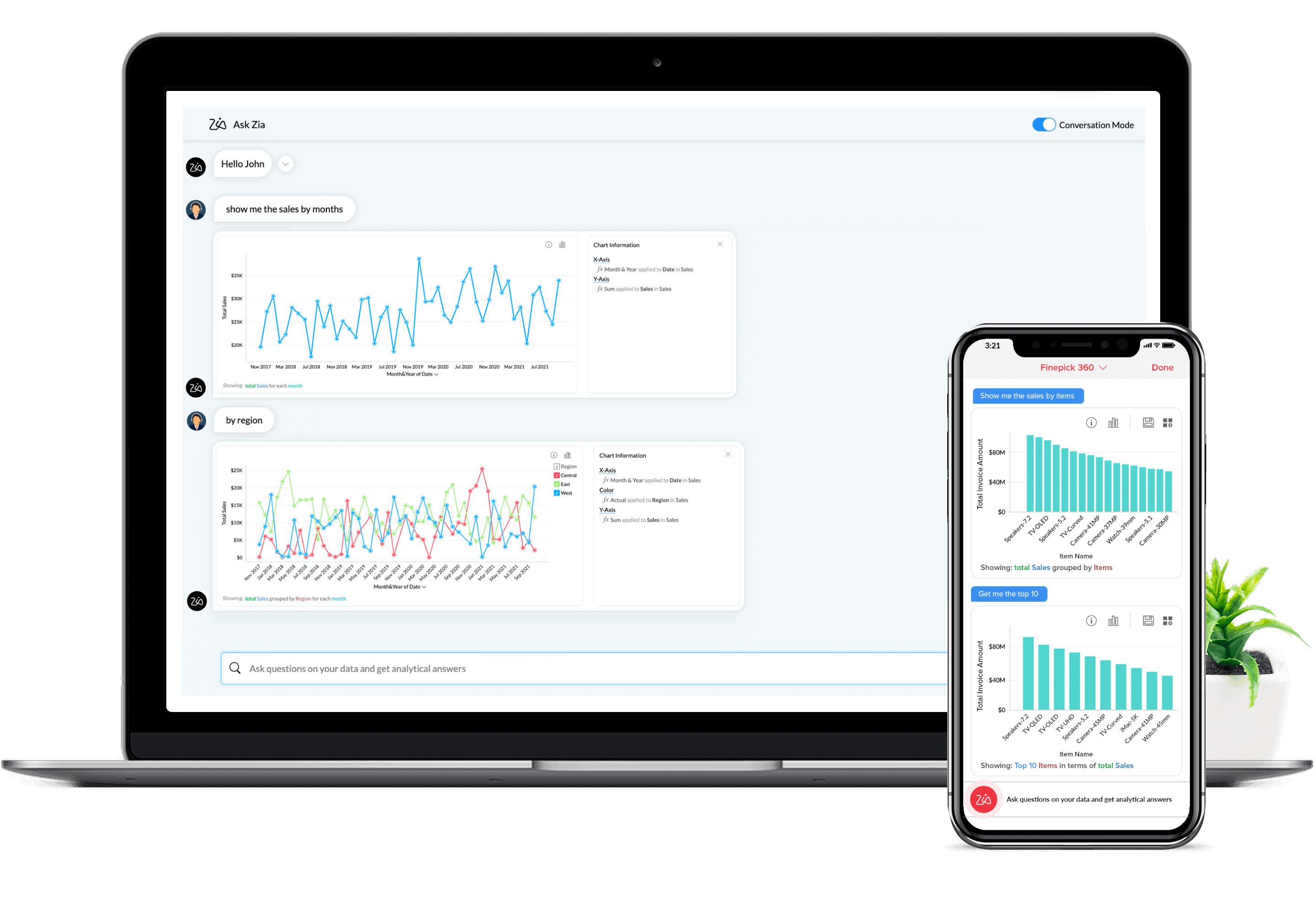 Zia is now available on your mobile device as an immersive chat-like interface. Carry your insights wherever you go, analyze on the move, and get powerful, real-time insights at your fingertip – anytime, anywhere.