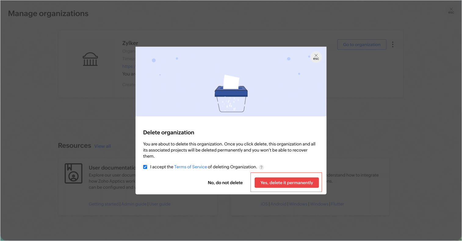 Note:  If your organization is deleted by mistake, please contact support@zohoapptics.com immediately to retrieve the deleted organization.