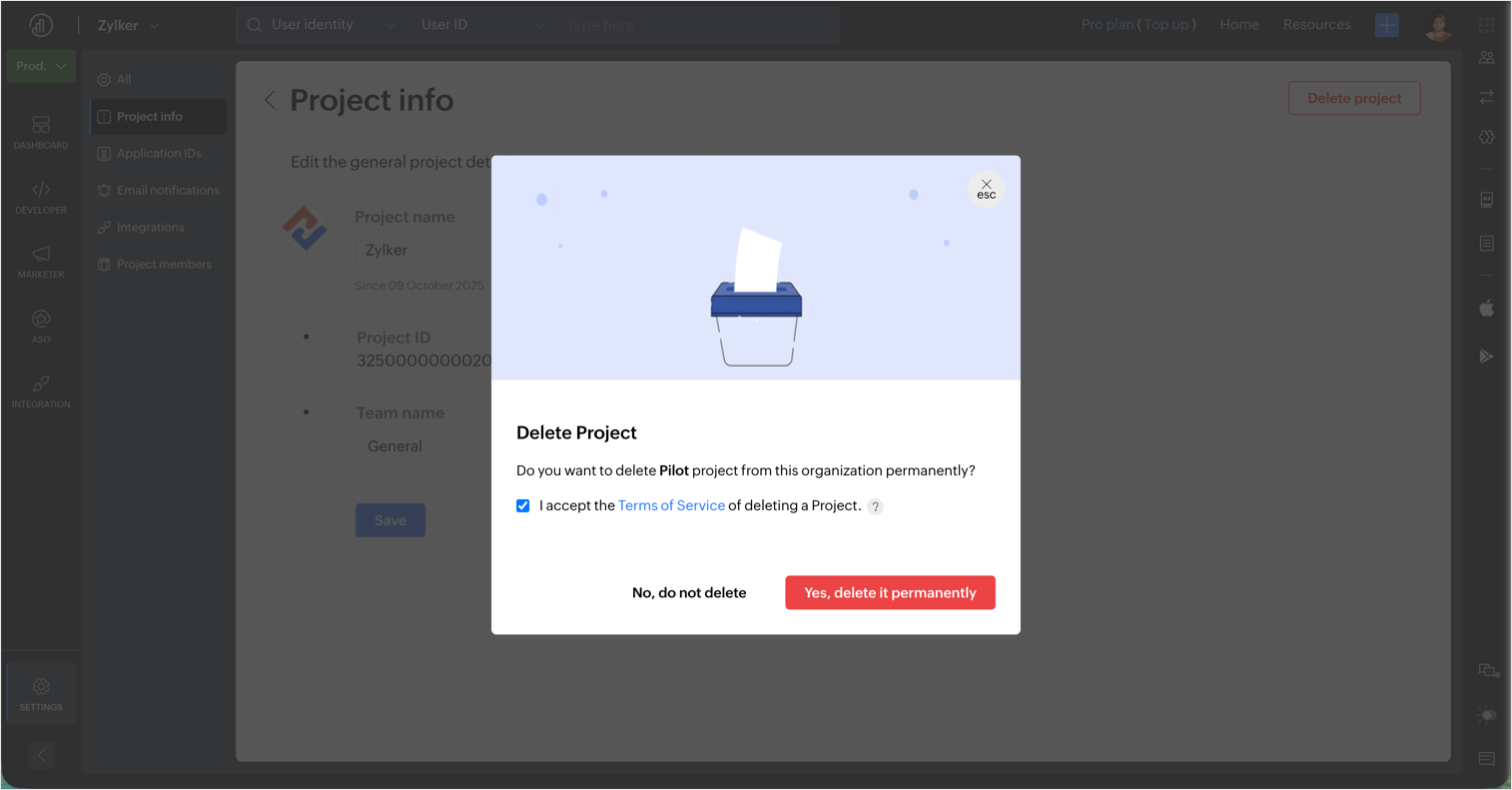 • Accept the terms and conditions of deleting a Project, click Yes, delete it permanently and the project will be deleted permanently.