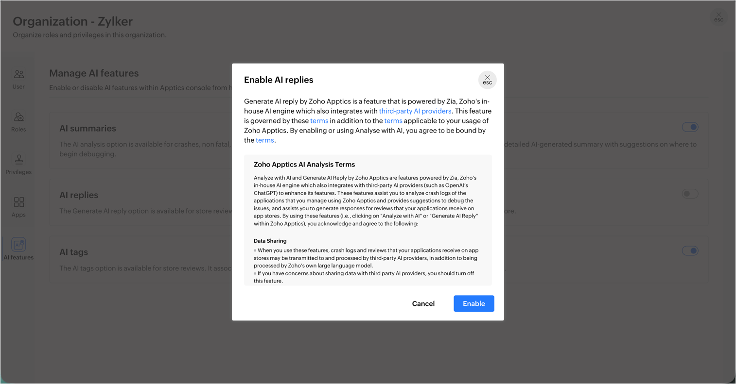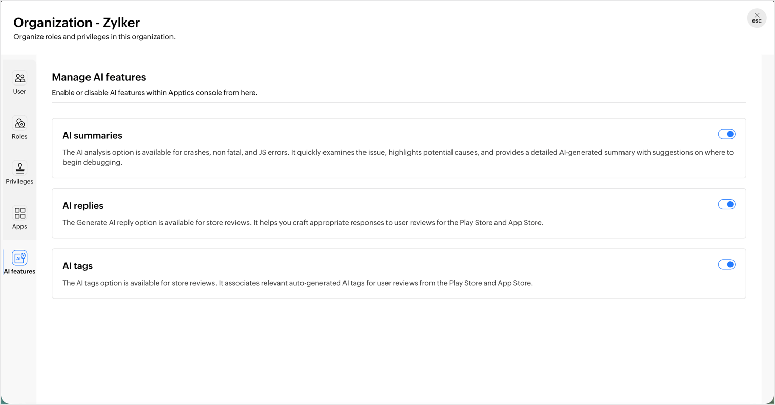 • From AI features section, you can enable or disable AI features available within Apptics console for the organization.