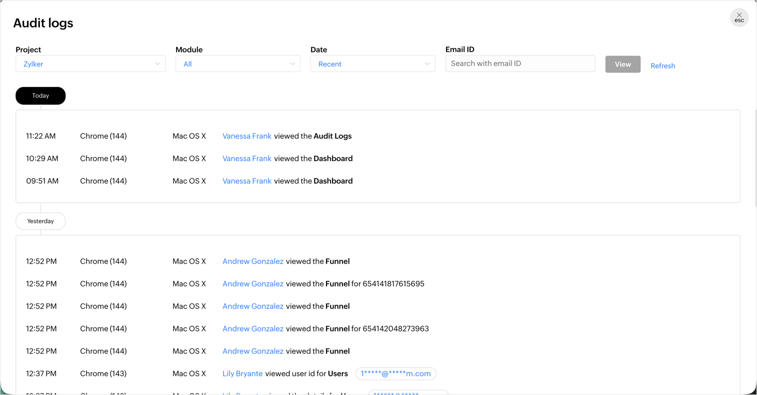 All user activity that happens for each project within the Apptics console are logged as audit logs in Zoho Apptics. The audit log entries can be accessed only by the organization admin, project manager, development lead, and developers by default and no one can edit/change/delete anything from the audit logs.