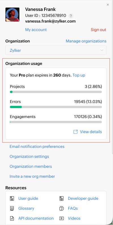 • You can check organization usage stats from the right menu > Organization usage. They include the project, errors, and engagement token limits based on your subscription plan.