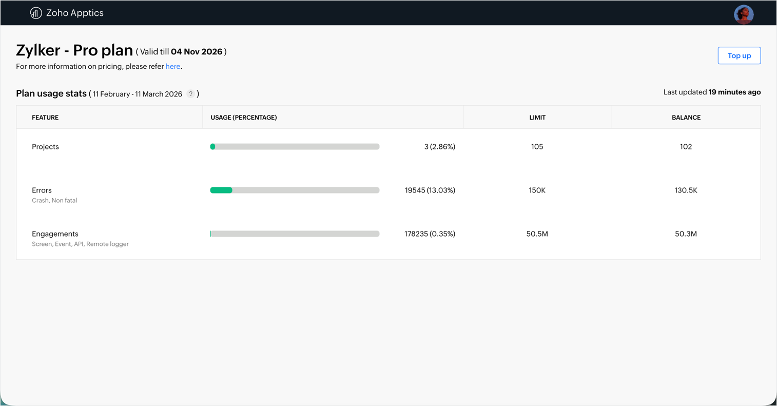 • Click on on View details to see the plan usage limits and balance available. You can also upgrade the plan in case of Free forever plan, or top up in case of Pro plan.