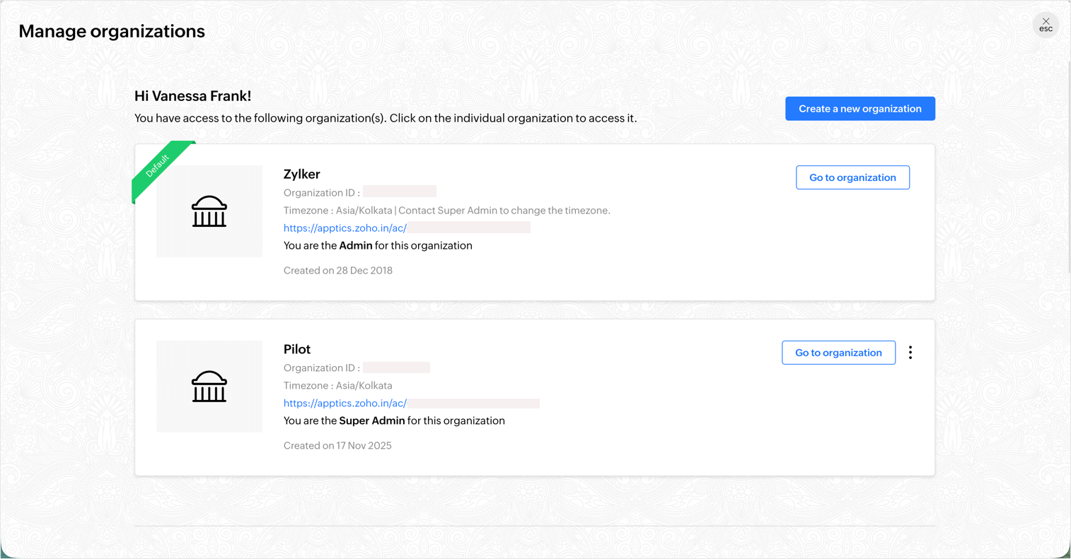 Once you create a new organization or become a member of an existing organization, you will see a list of all the orgs you can access with your role for each org.