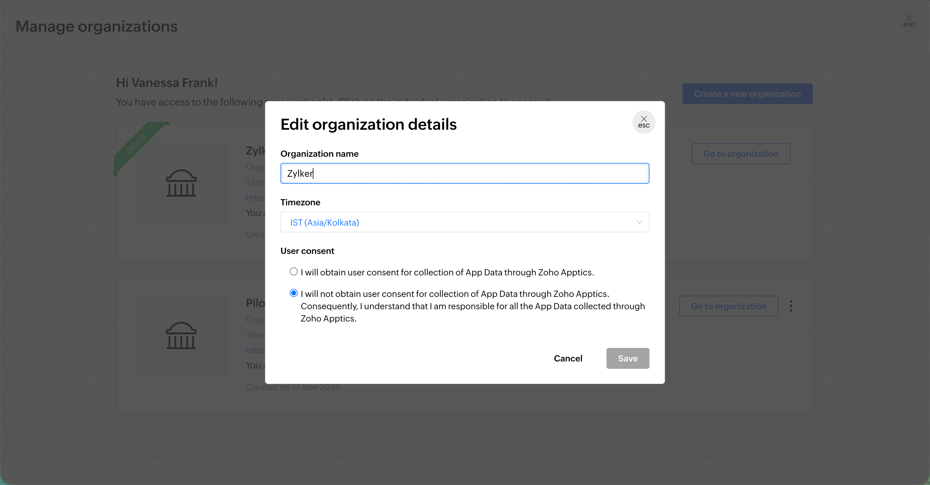 As a super admin you can change the organization's name, timezone, and user consent management preference as per your convenience.