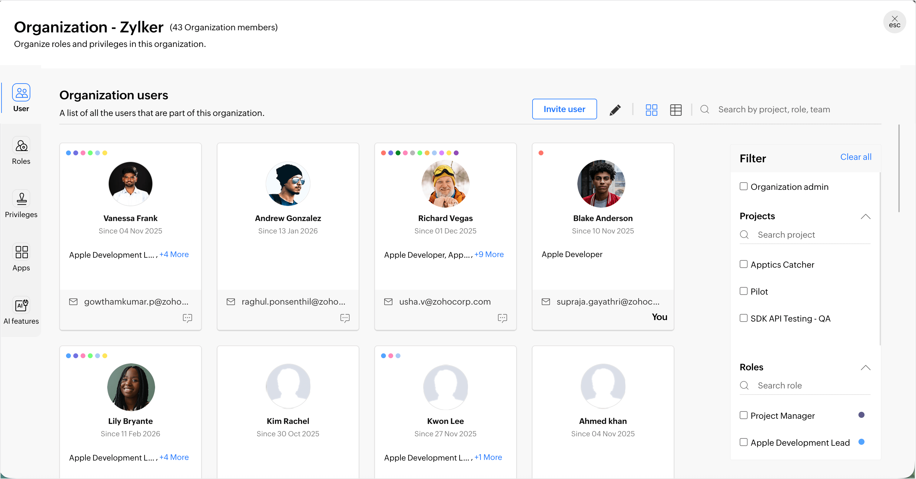Note: You can configure roles and privileges to org members as org admin or configure roles on the project level as a project manager from the org settings.