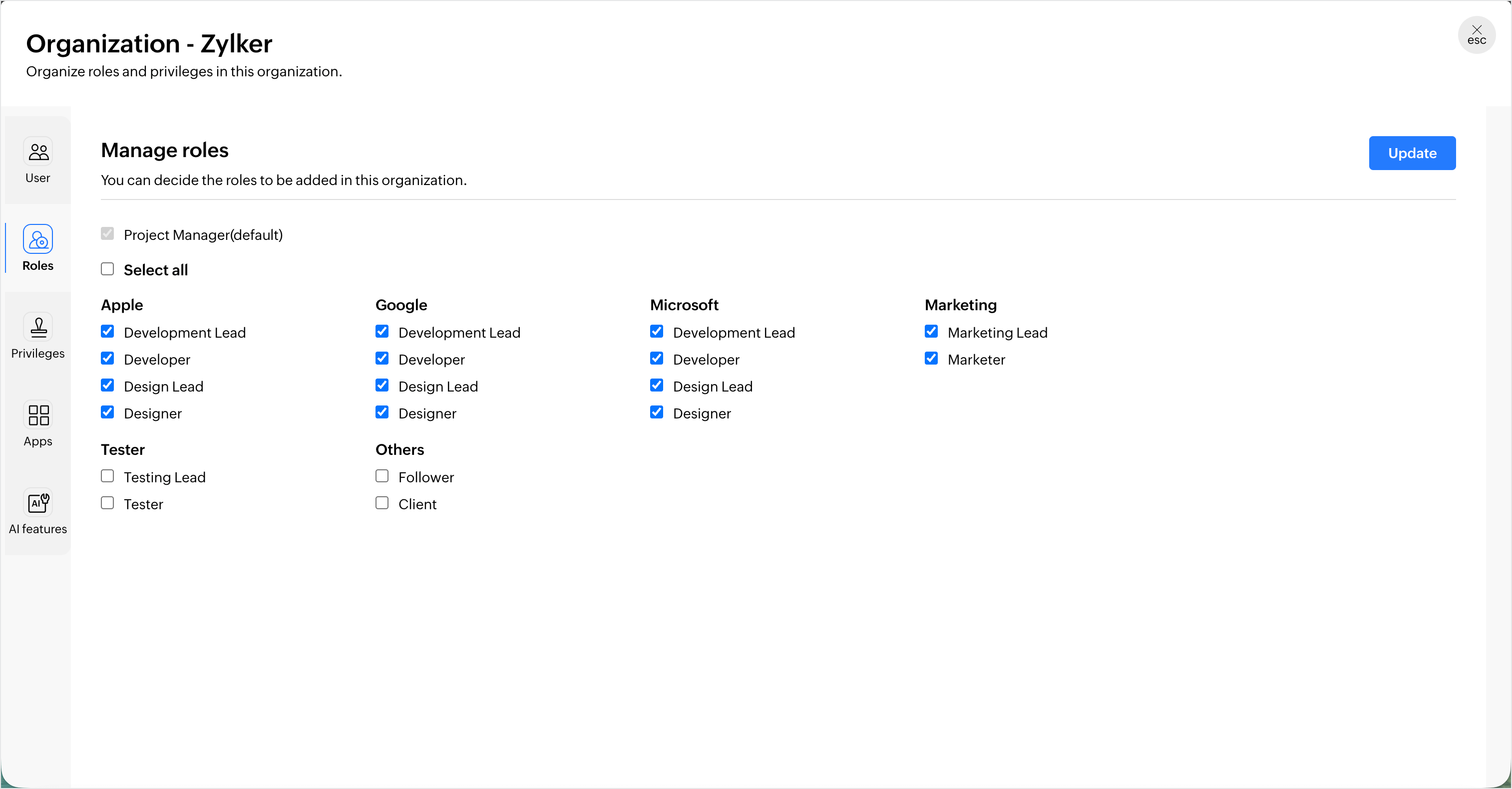 Click on Roles to select the roles you want to include in the organization apart from the default roles (Super admin, Organization admin, and Project manager), and click Update to save the configured roles.