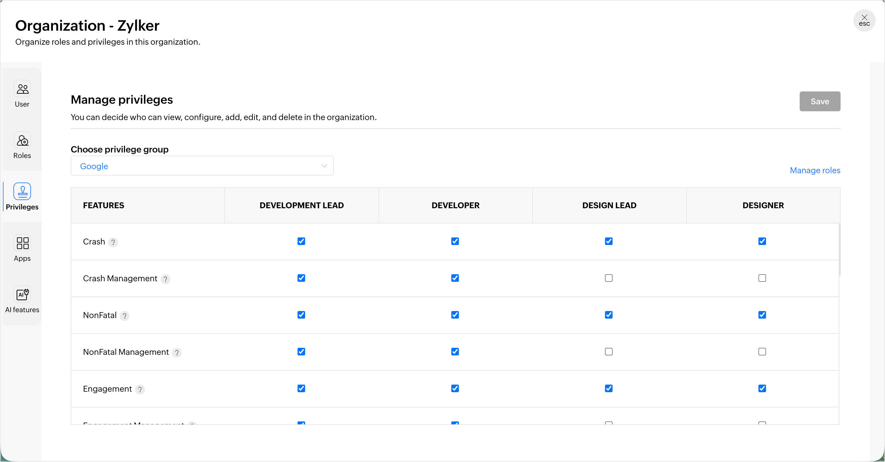 • Choose the privilege group for which you want to set permissions for each feature module. For example, let us say you choose Google for the privilege group, you can set permissions only for the roles you have assigned under the Google ecosystem.