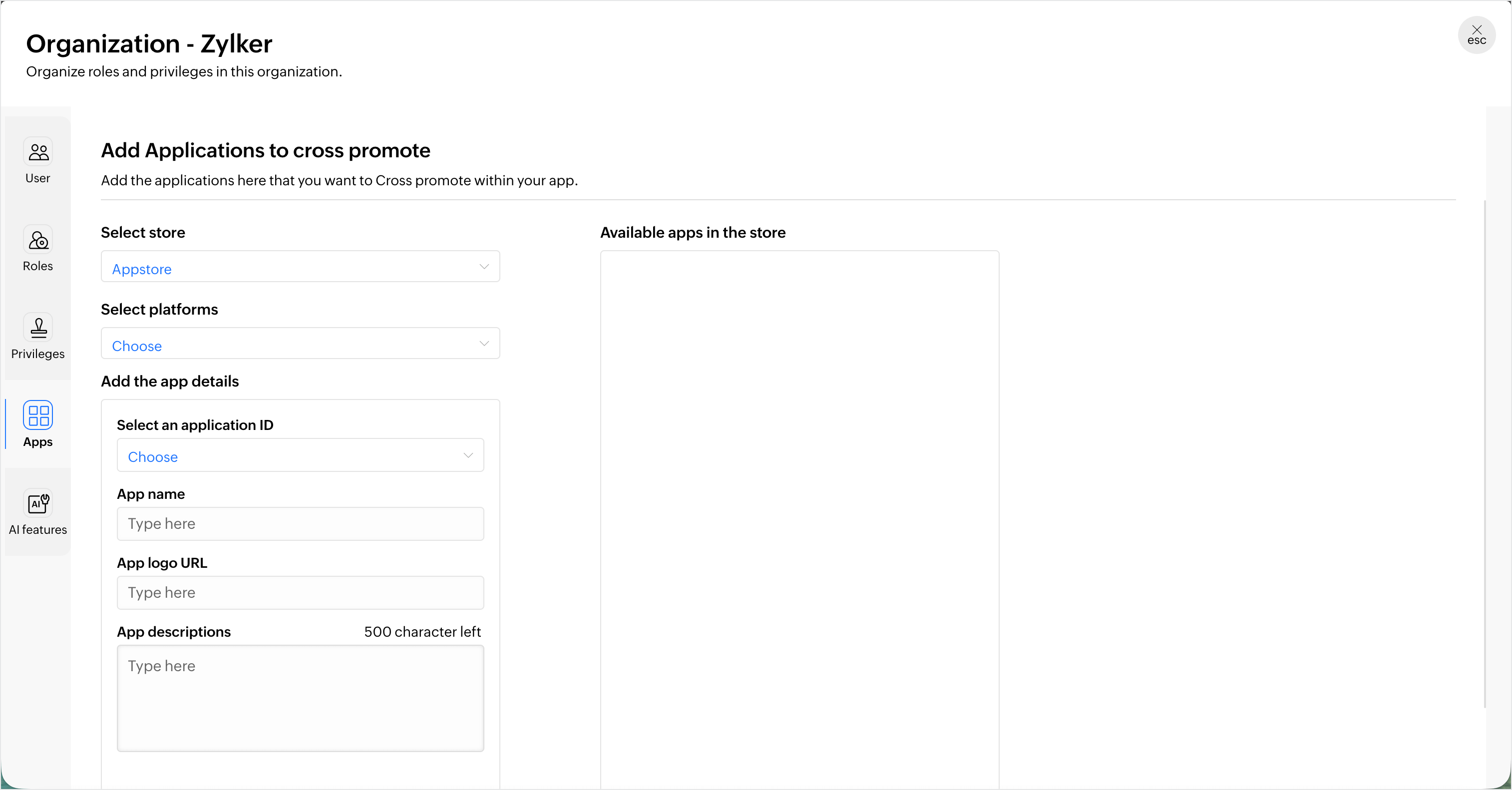 Organization settings allows you to organize roles and privileges, configure role-based access for the organization, add the other family apps to cross-promote within your app, and manage the use of AI features within the Apptics console for your organization.