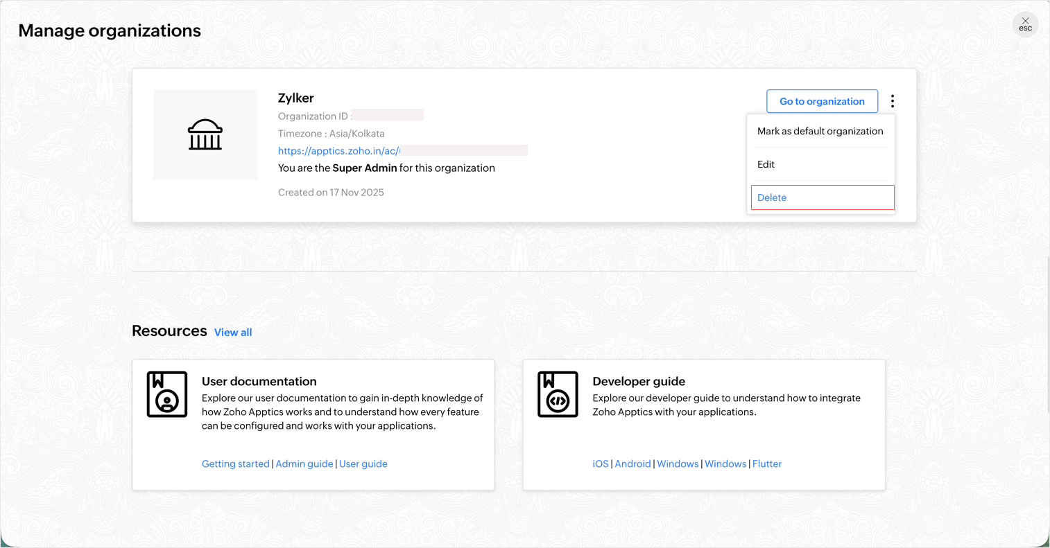 Note: Only the super admin can edit the organization name or delete an organization in Apptics.