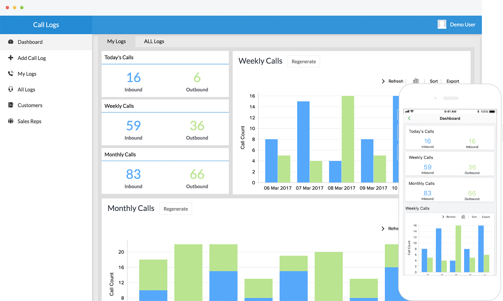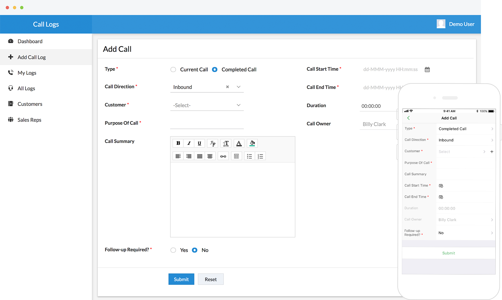 يمكن لمندوبي المبيعات إدخال المعلومات المهمة وتحديثها بسرعة، مثل وقت بدء المكالمة ووقت انتهائها ونوعها والغرض منها، وتفاصيل العميل. ويمكنهم عرض السجلات الخاصة بهم وكذلك سجلات فريقهم.