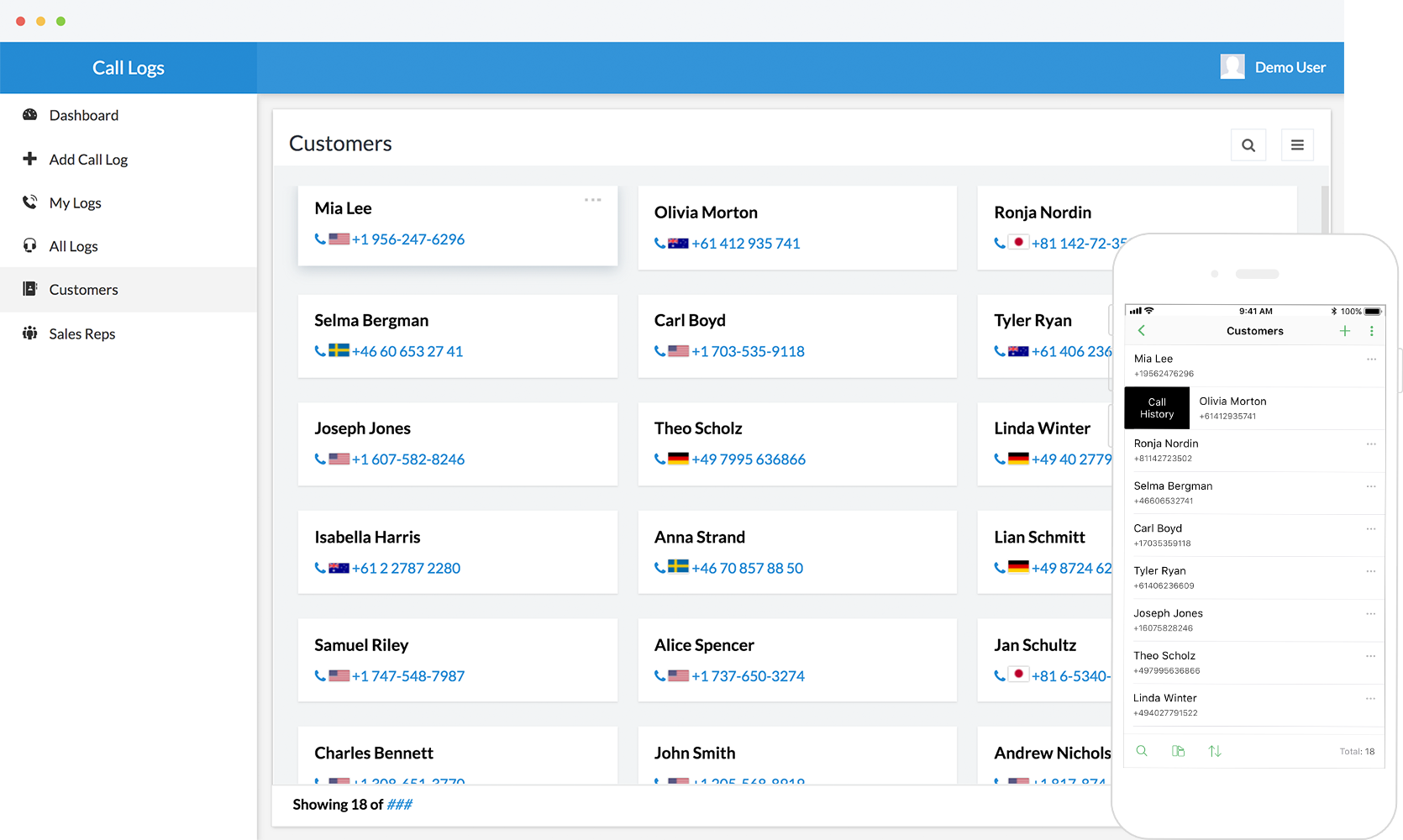 نظرًا إلى أن التطبيق مدعوم على كل الأجهزة المحمولة، لم يعُد هناك حاجة إلى أن تكون متواجدًا في مكتبك طوال الوقت. قم بتعيين المكالمات وتسجيلها، وإدخال تفاصيل العملاء، وعرض محفوظات المحادثات أثناء التنقل.