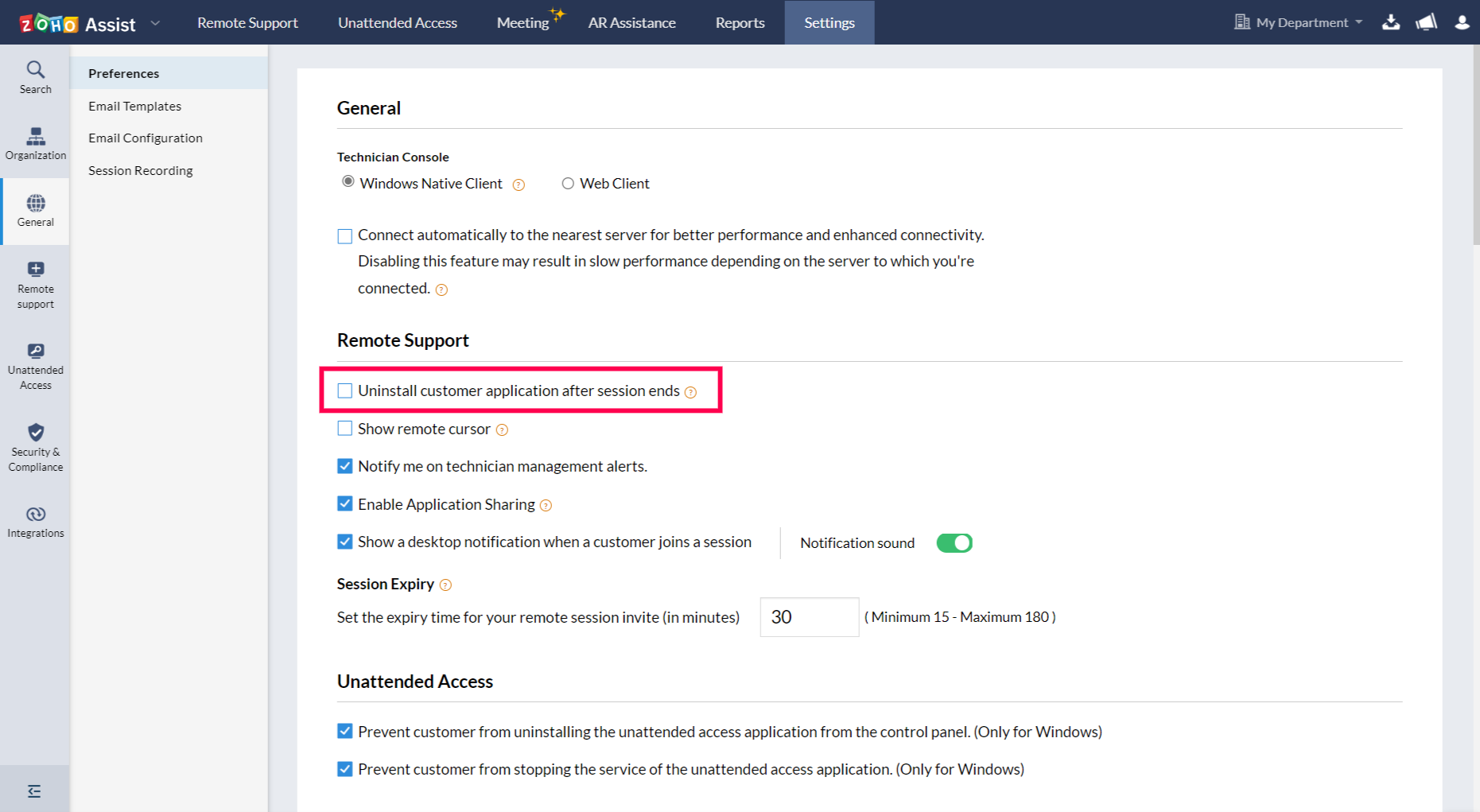 Note: The Zoho Assist agent will no longer uninstall automatically from the customer's device after the session ends until the feature is enabled again.