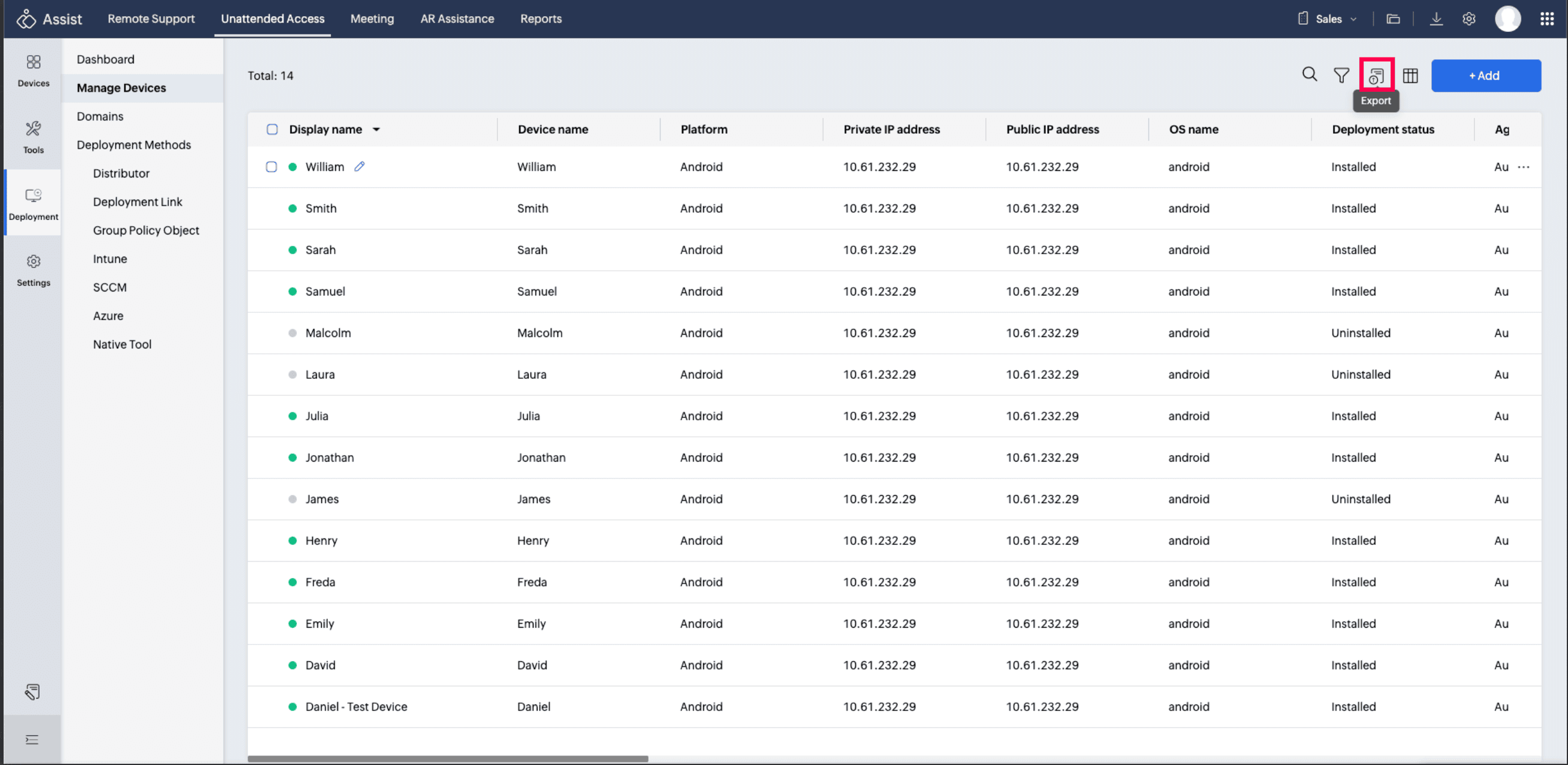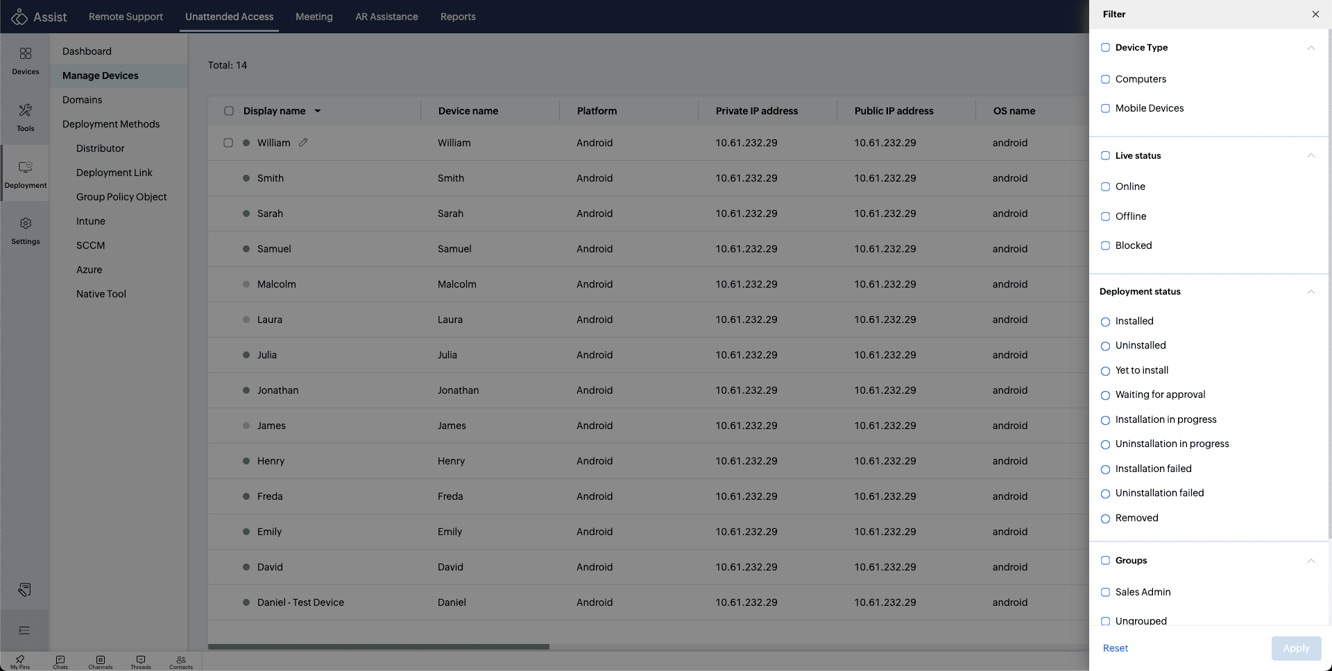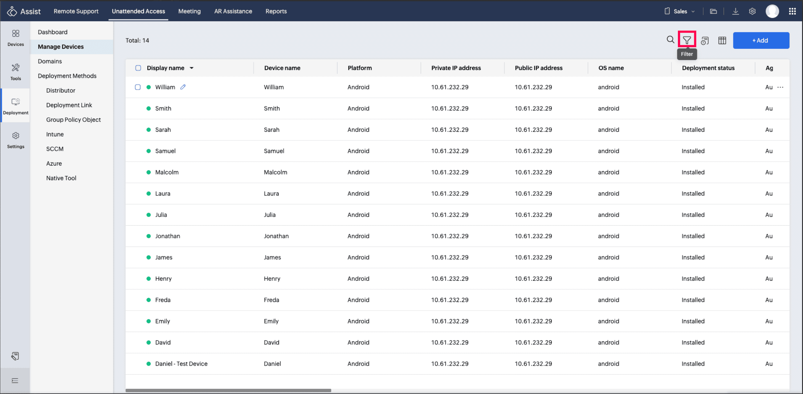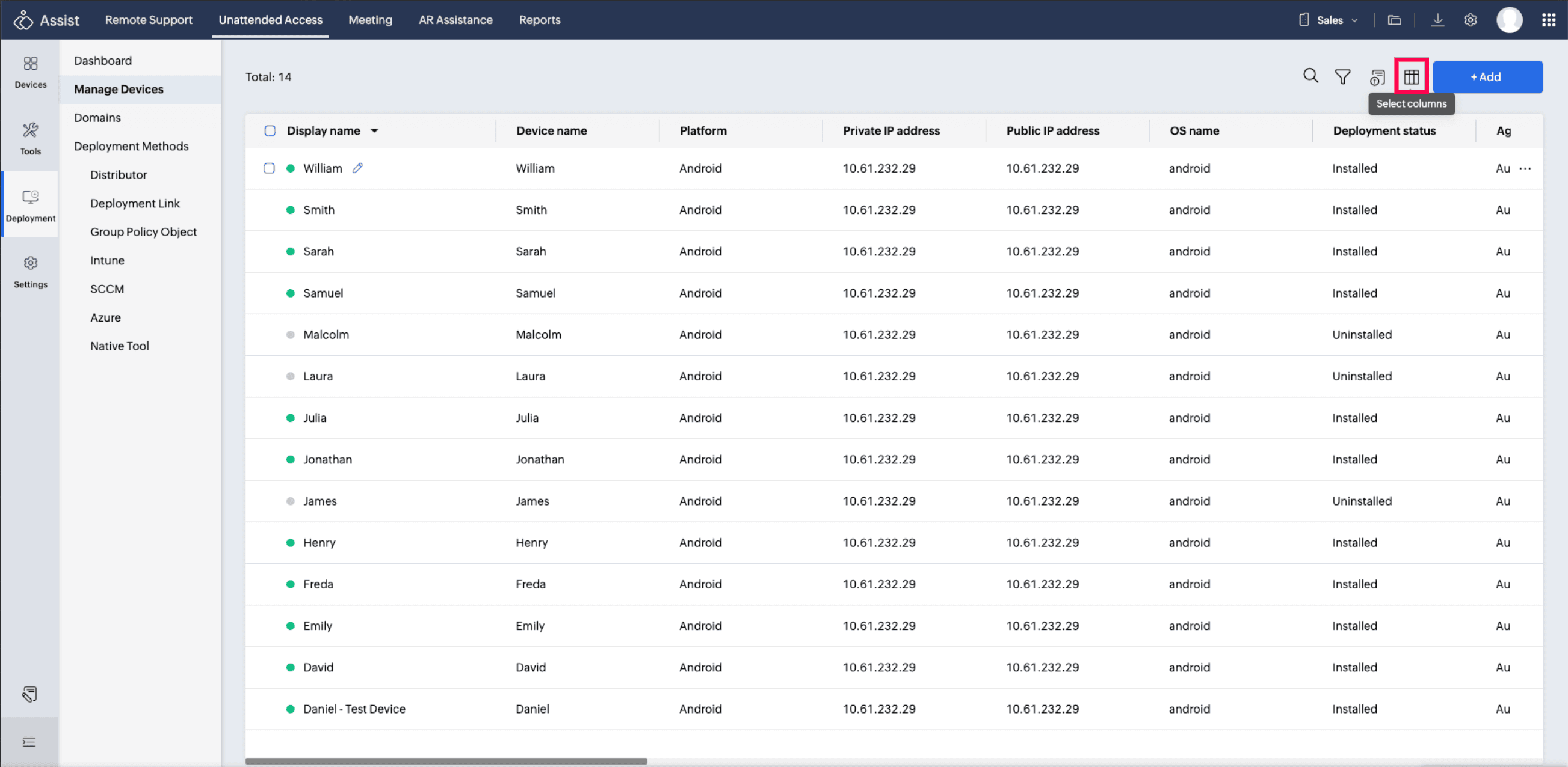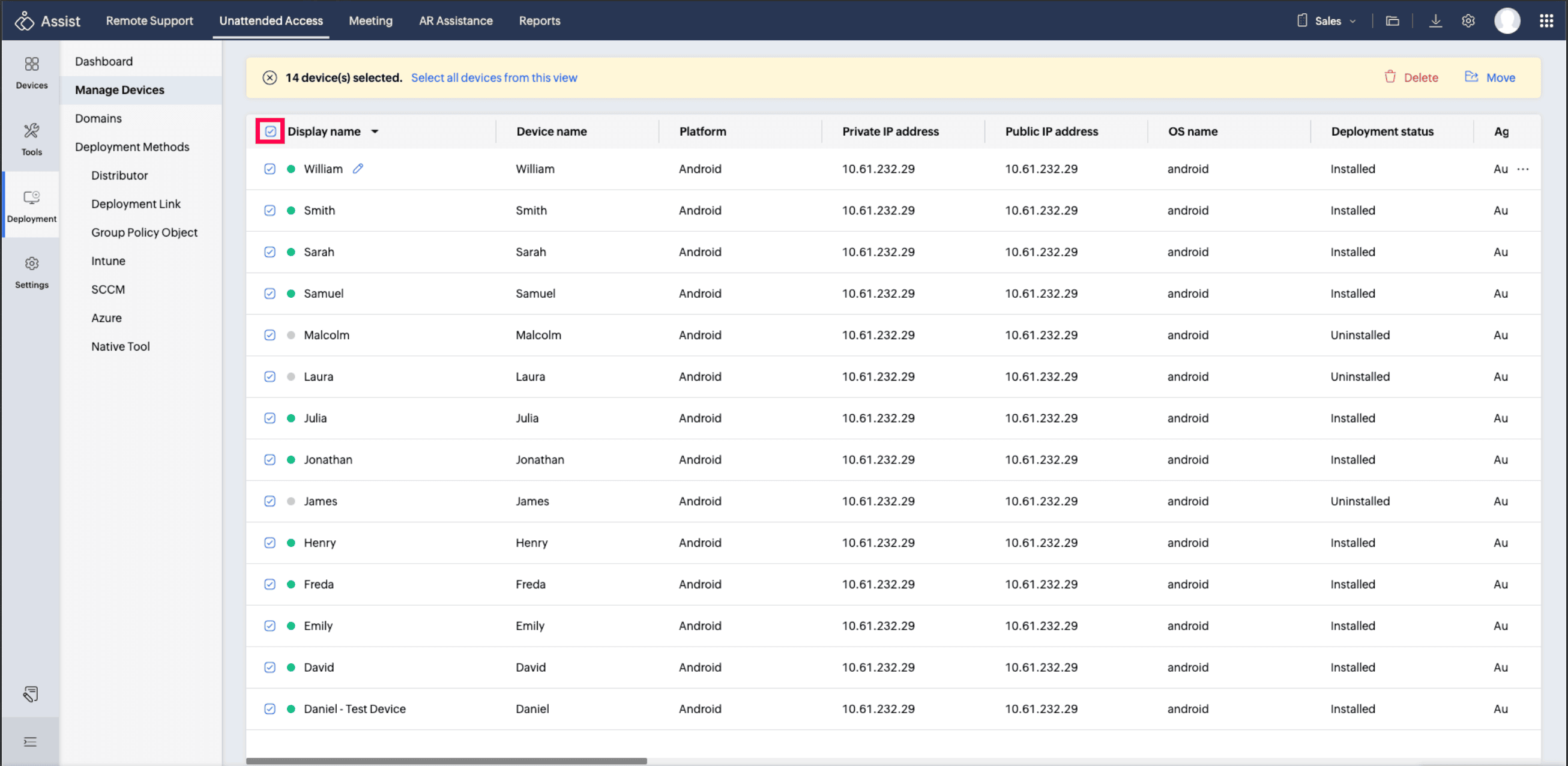 - Navigate to Unattended Access > Deployment > Manage Devices. By default, all devices in the current department will be displayed.