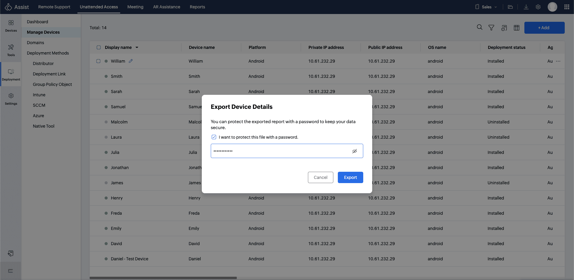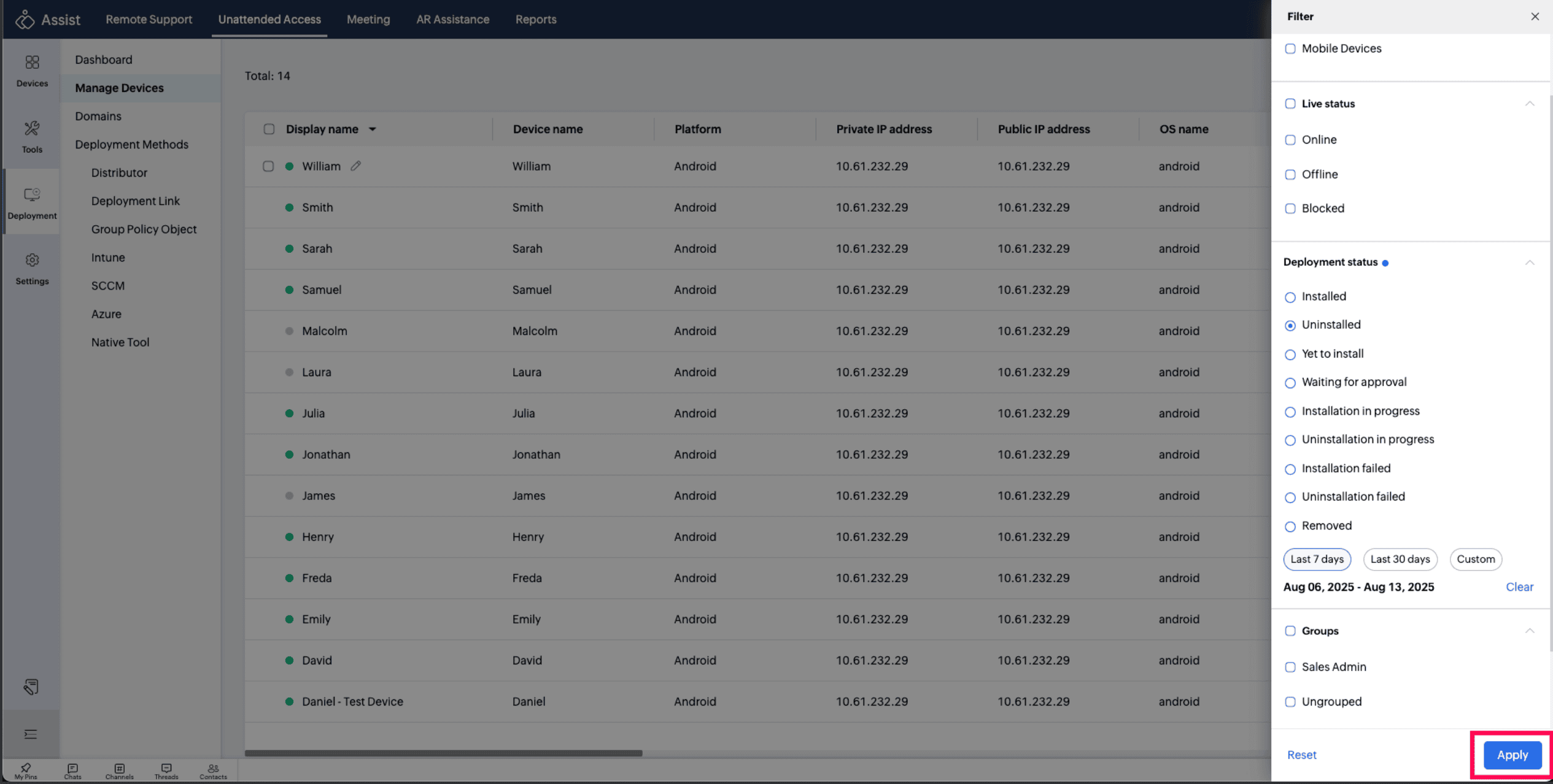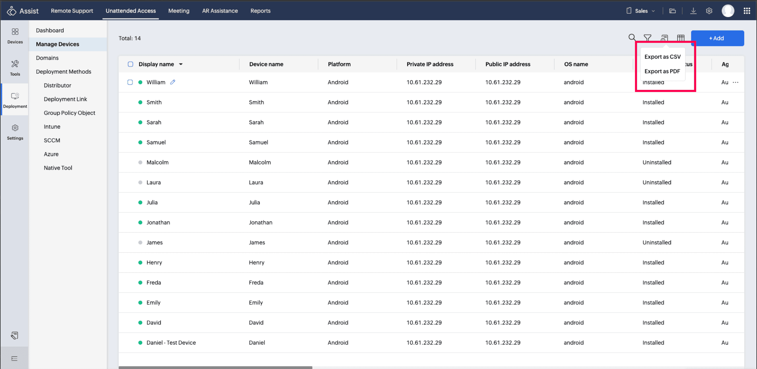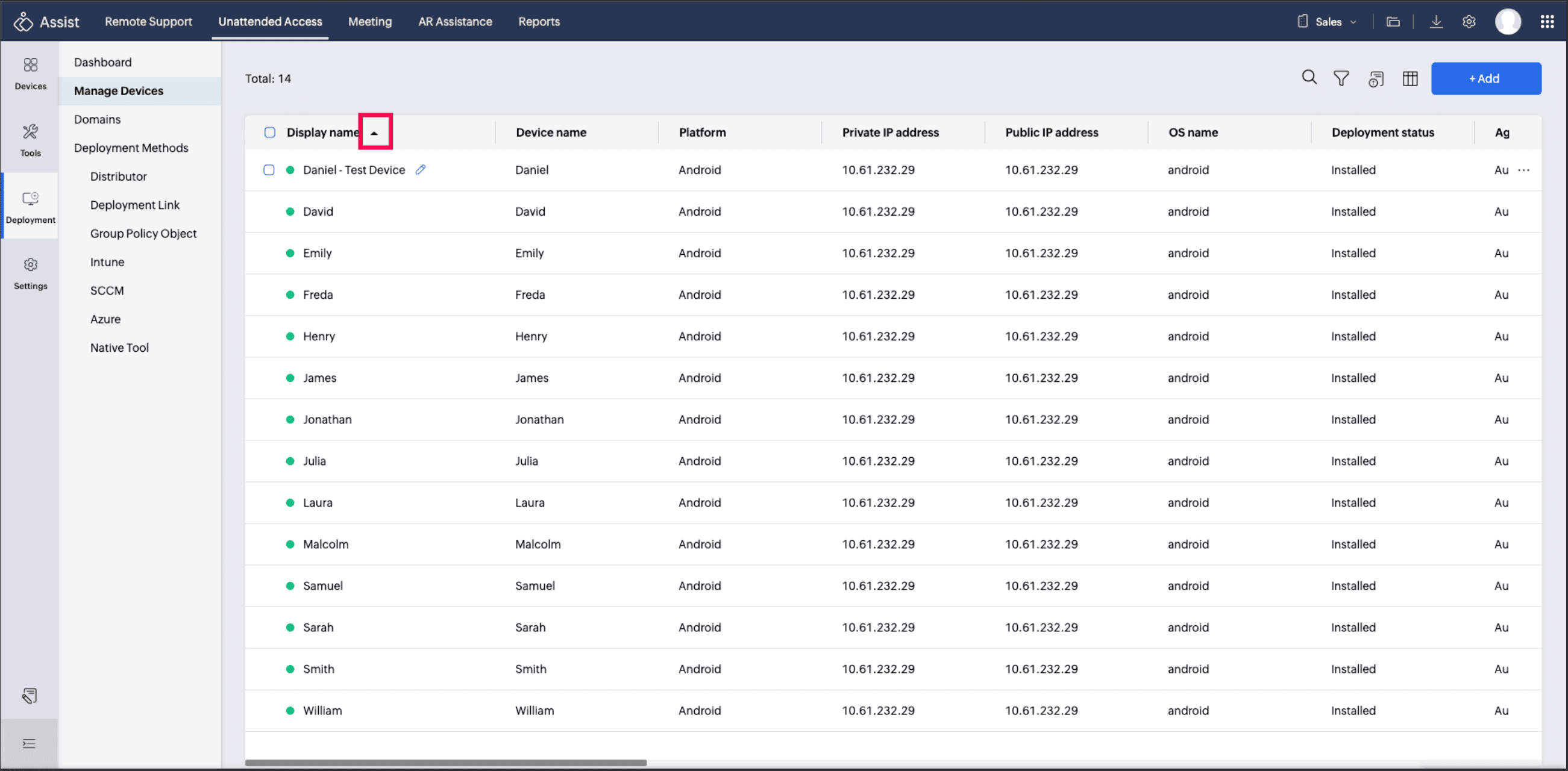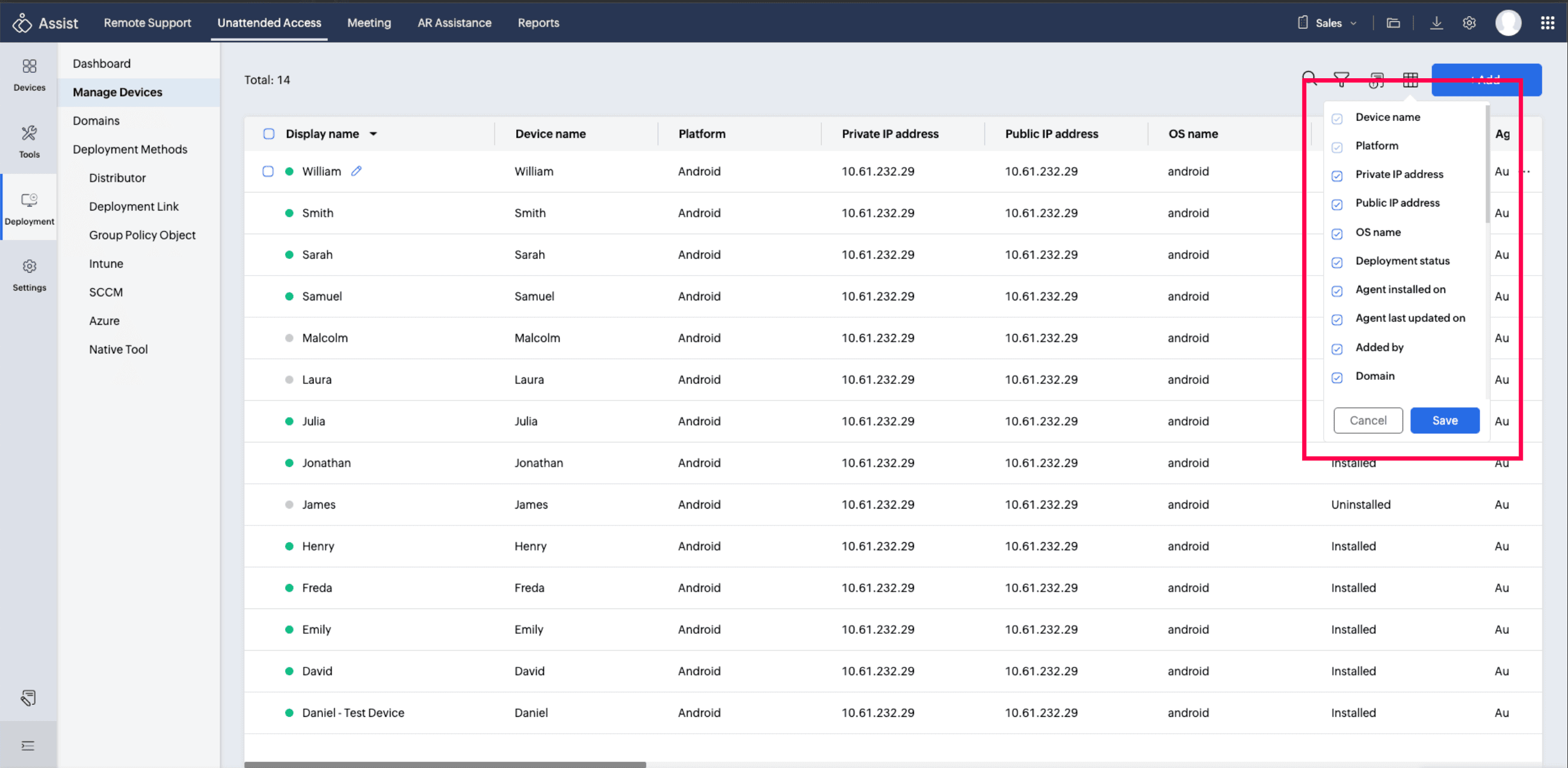 - Navigate to Unattended Access > Deployment > Manage Devices. By default, all devices in the current department will be displayed.