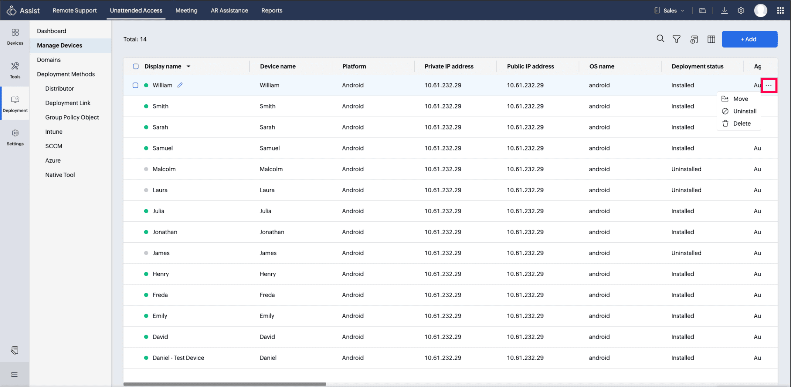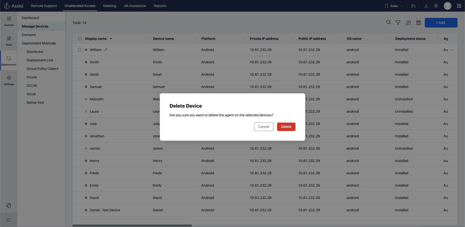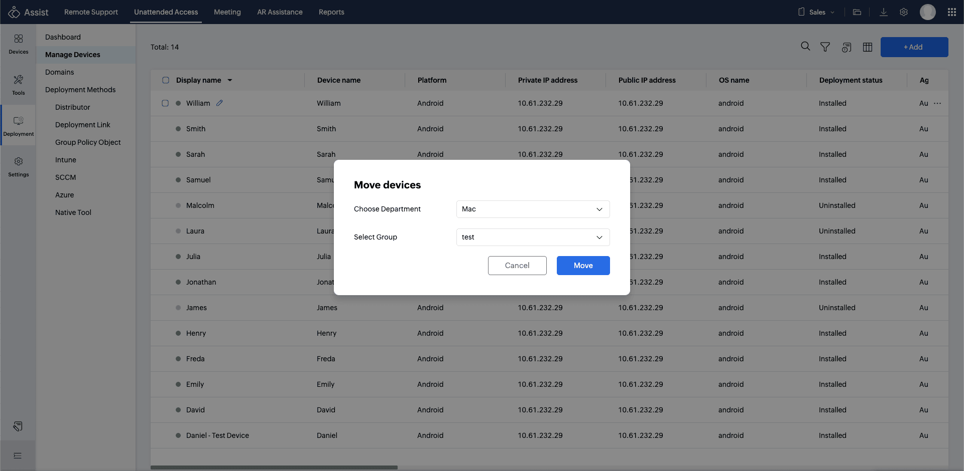 The Manage Devices section displays all devices configured for unattended access. From here you can deploy, rename, uninstall, delete, and move devices to other departments.