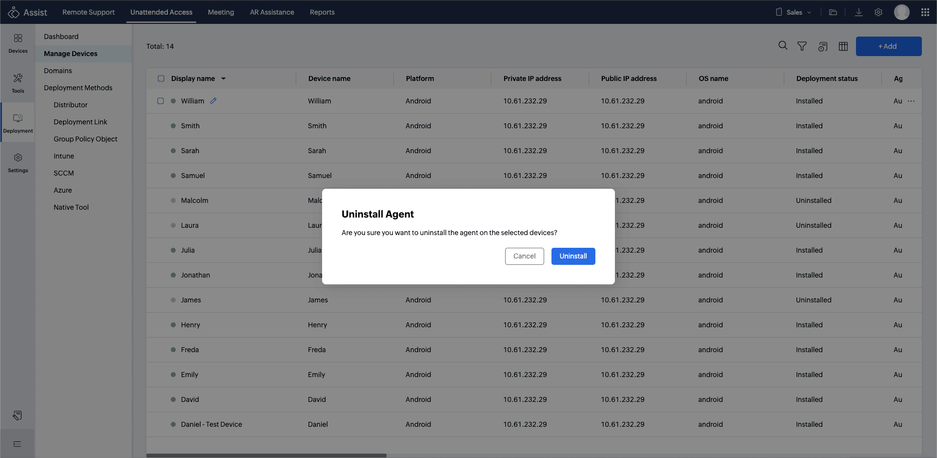 Note: You can only uninstall the unattended access agent if the device is online. Devices that are uninstalled or removed will continue to occupy a license.