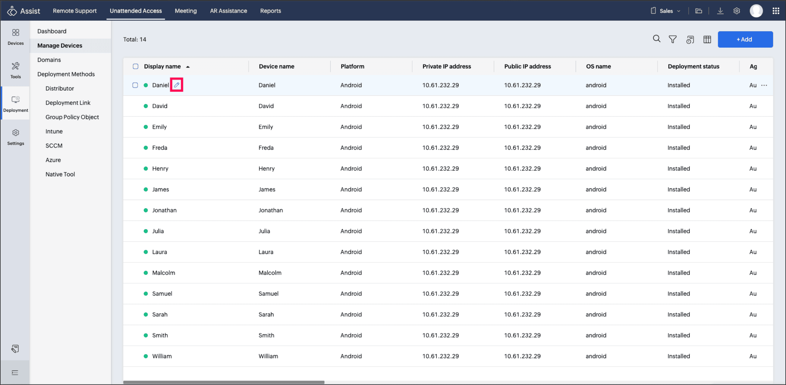 - Click Edit to modify a device name. This change will only update the display name shown in the console; the actual device name on the remote computer will remain unchanged.