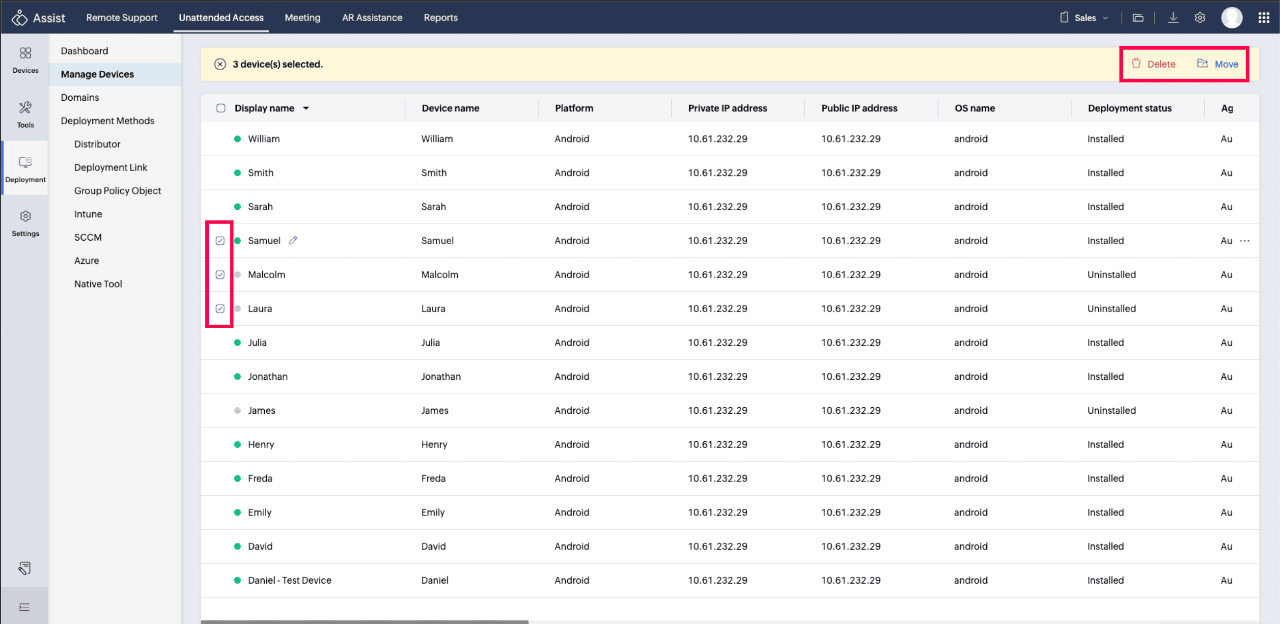 - To delete or move multiple devices, select any number of devices manually and choose Delete or Move.