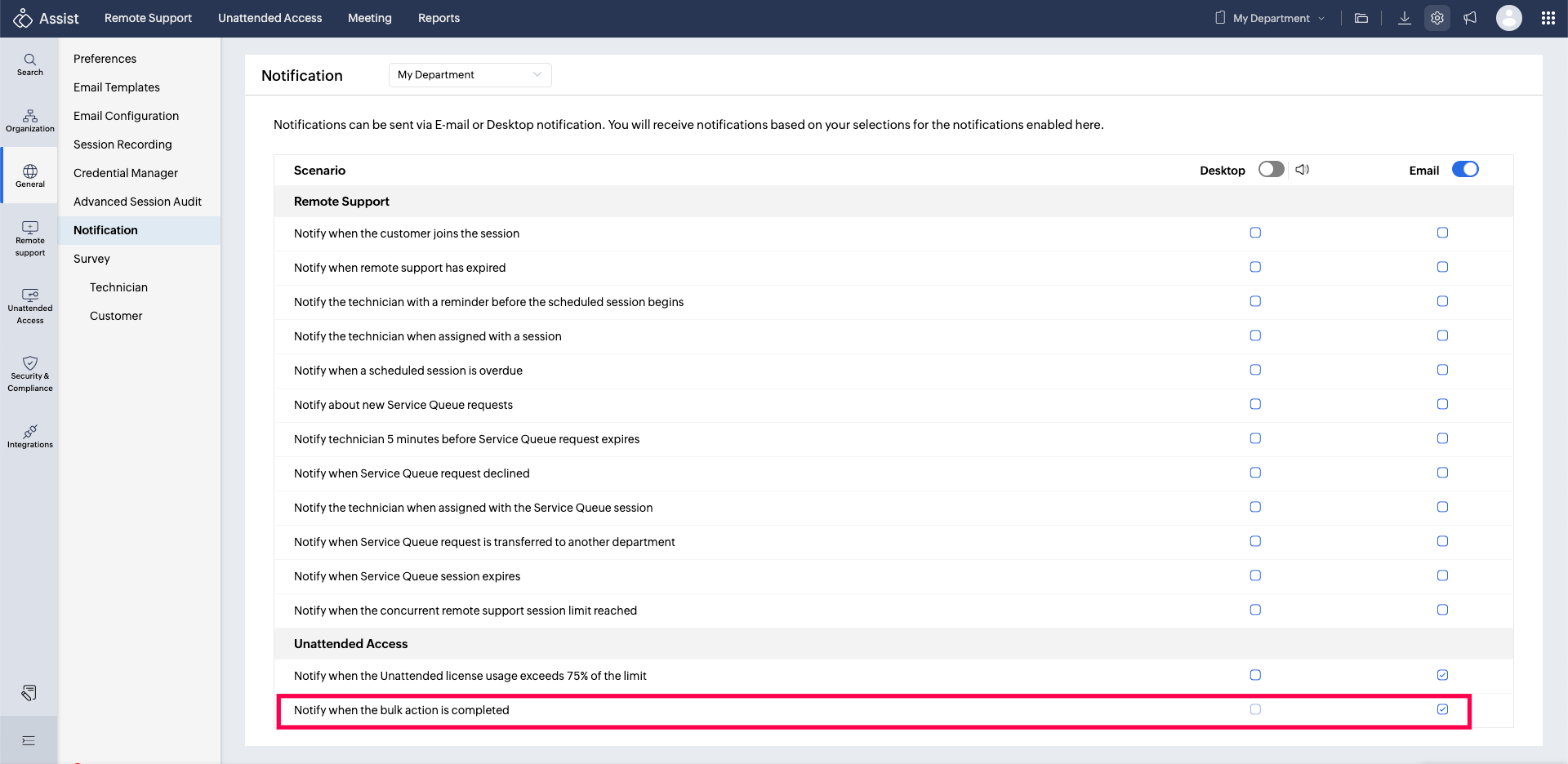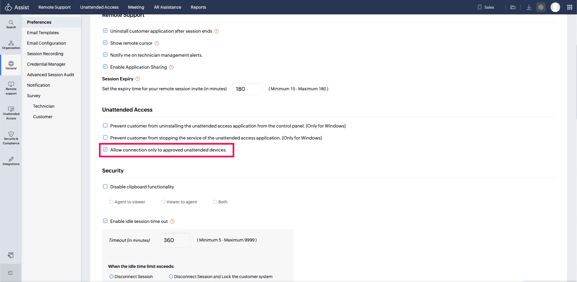 - Under Unattended Access, select the checkbox Allow connection only to approved unattended devices to enable deployment based on admin approval.