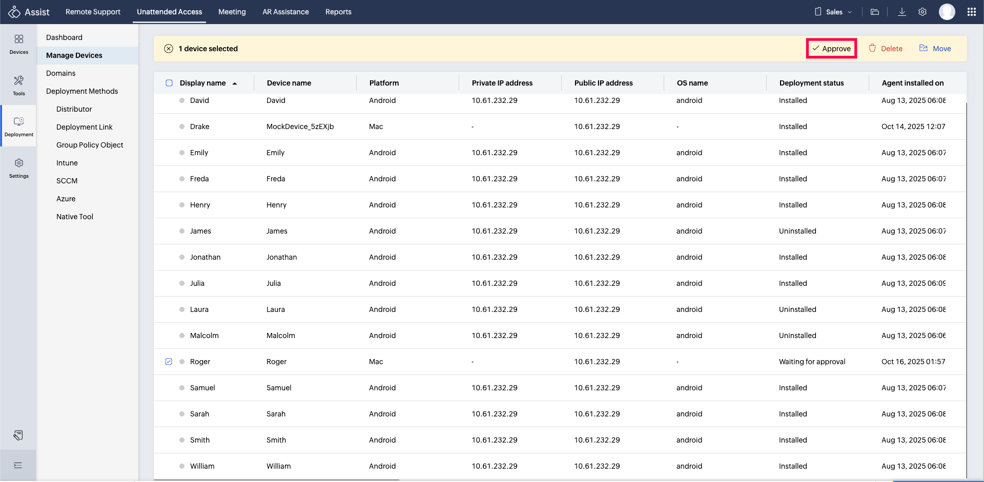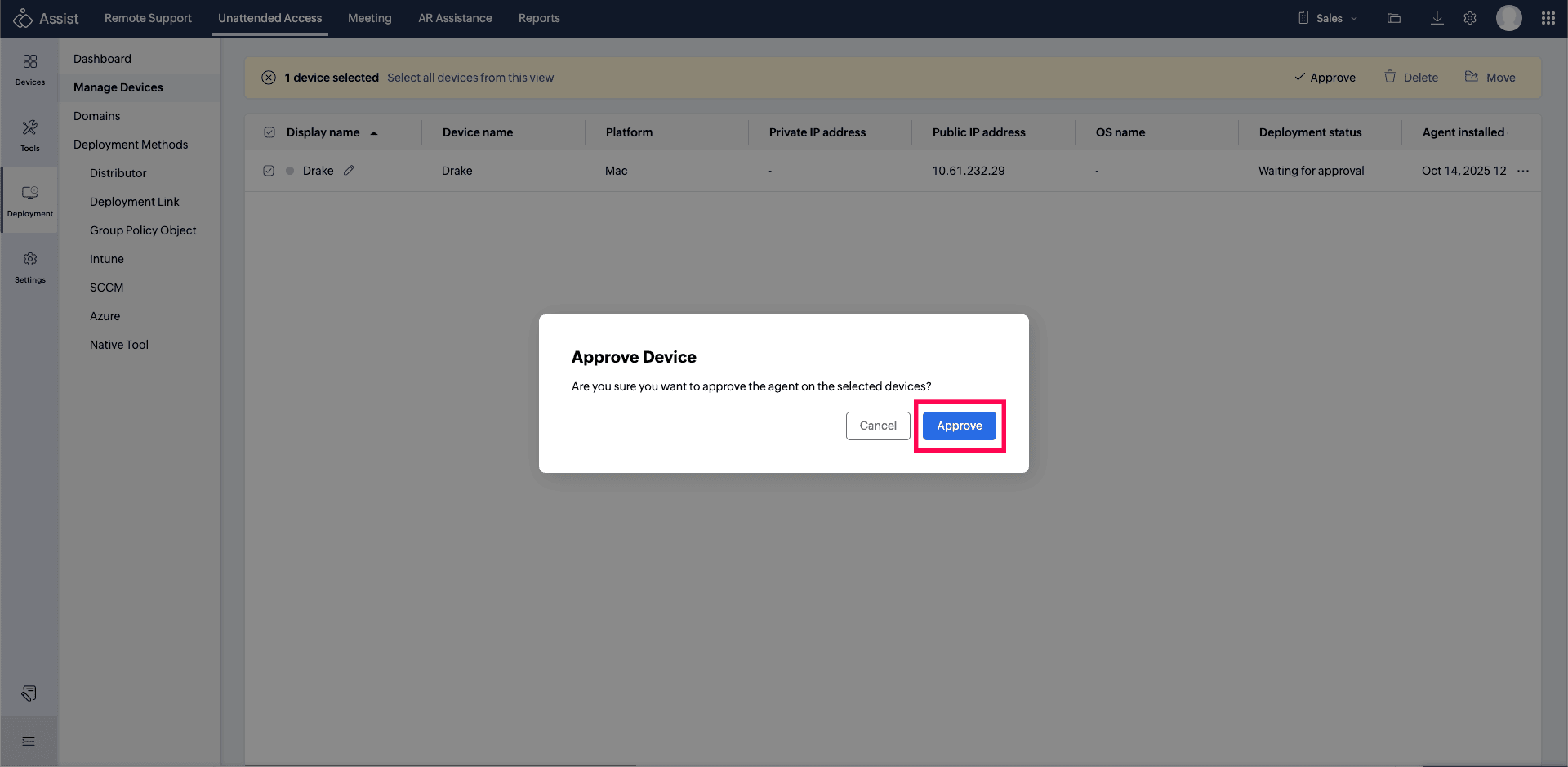 - Select the device(s) you want to approve for unattended access and click Approve.