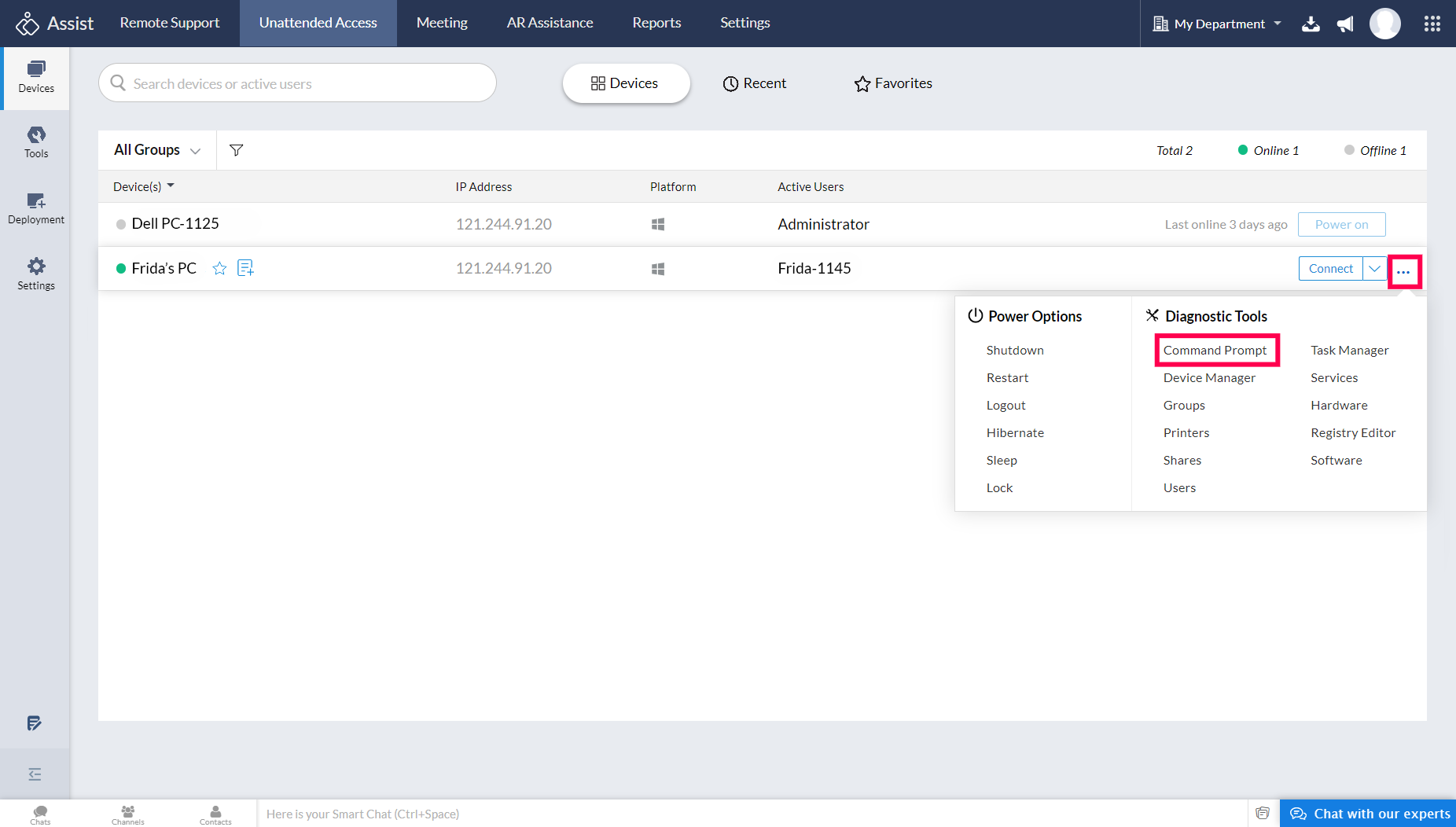Click the command prompt option from the drop-down menu. You will be redirected to the new page for the remote device with Windows Operating system.