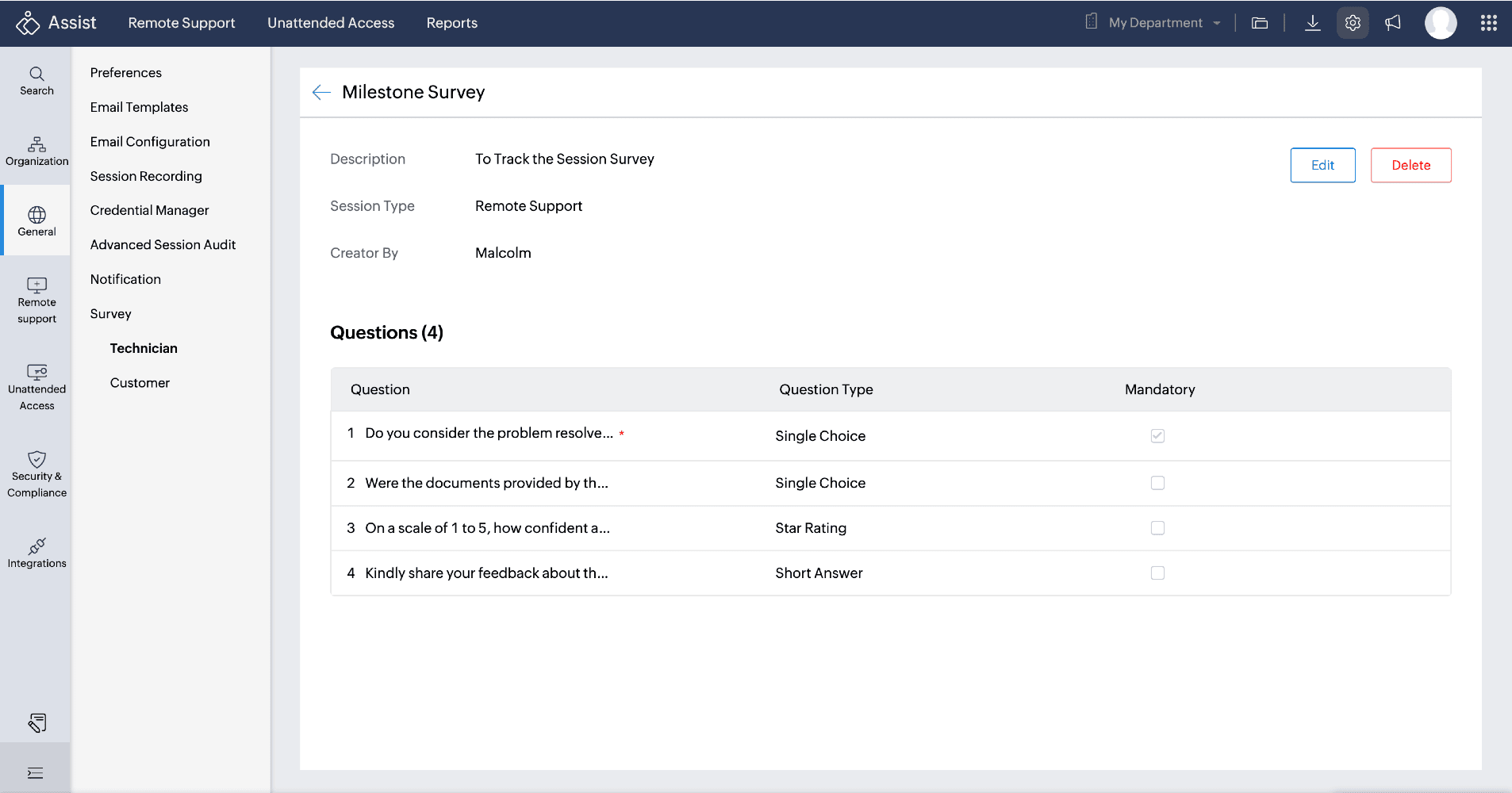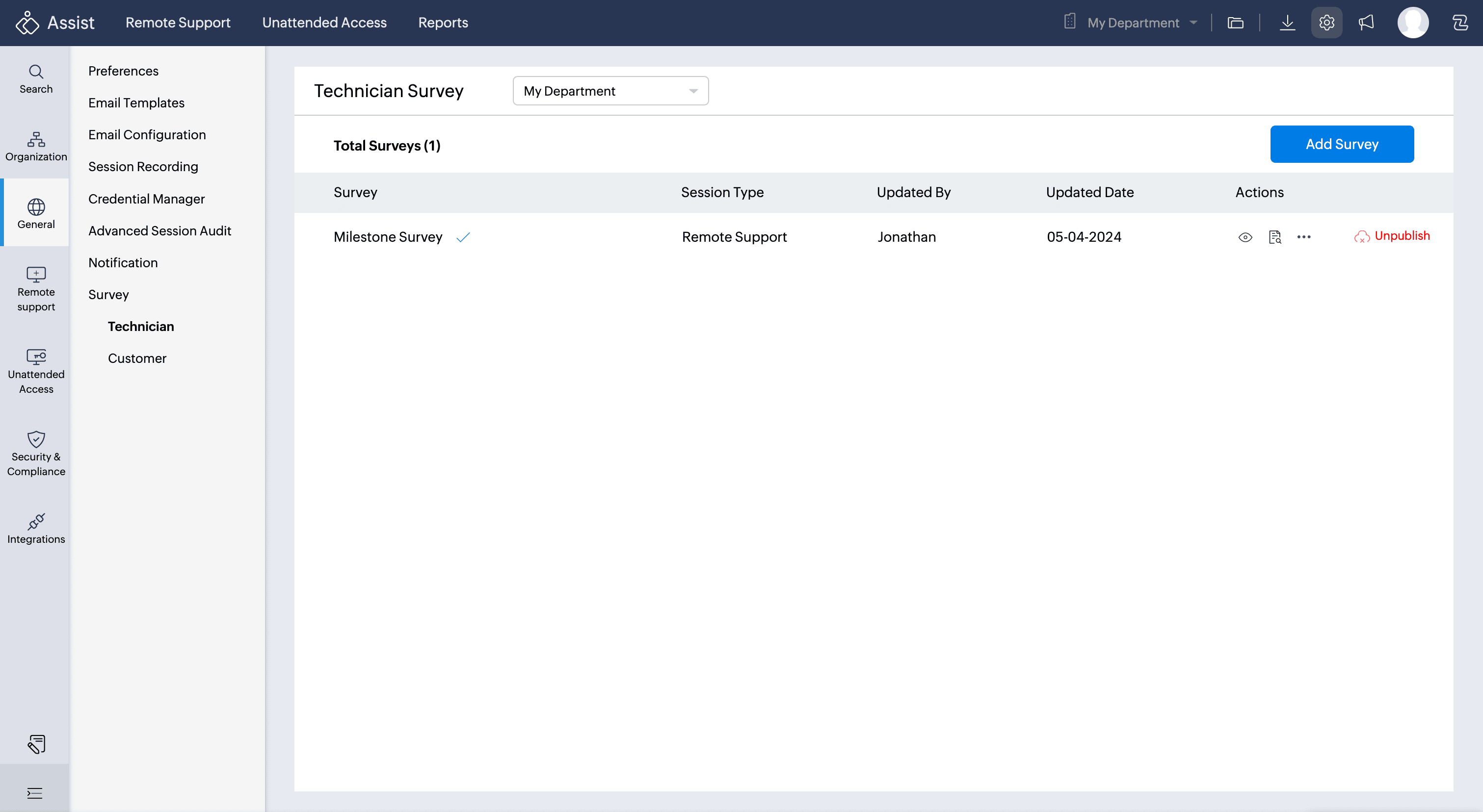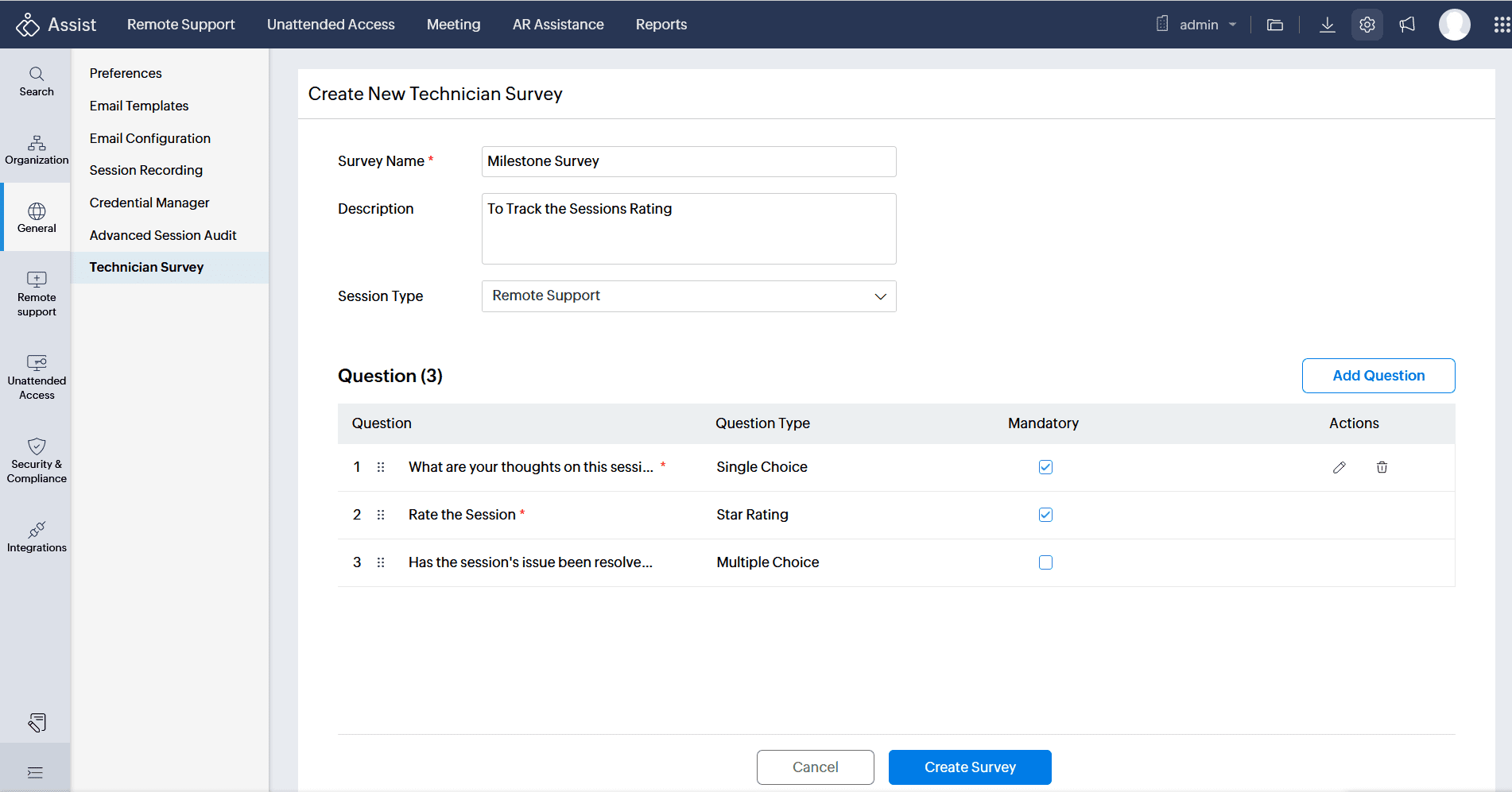 The Technician Survey feature allows technicians to share their valuable feedback, contributing to the improvement of remote service quality. After the completion of a remote session, technicians are prompted to fill out a survey form, providing insights into the remote assistance experience. These responses can be compiled into Survey Reports for detailed analysis at a later stage.