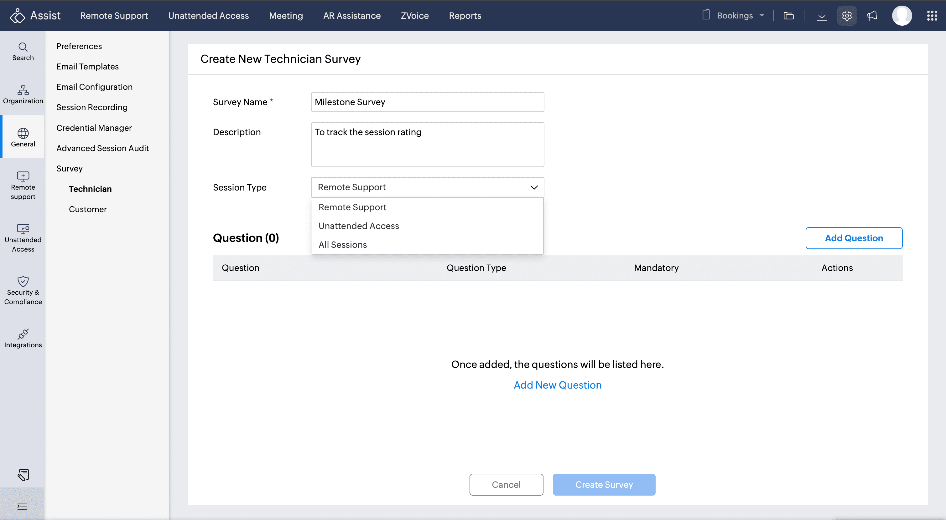 - Click Create New Survey and provide details like Survey Name and Description, and select the session type from the drop menu.