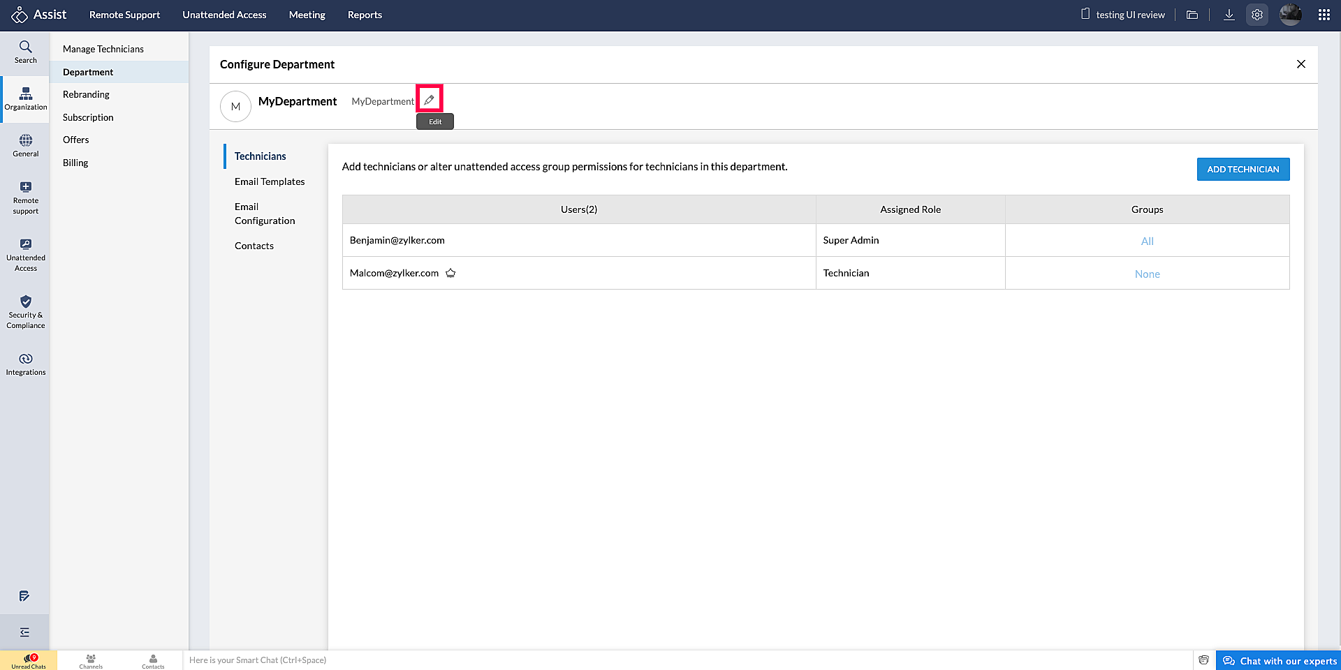 - Irrespective of the role in the organization, any technician can be given Department Admin privileges.