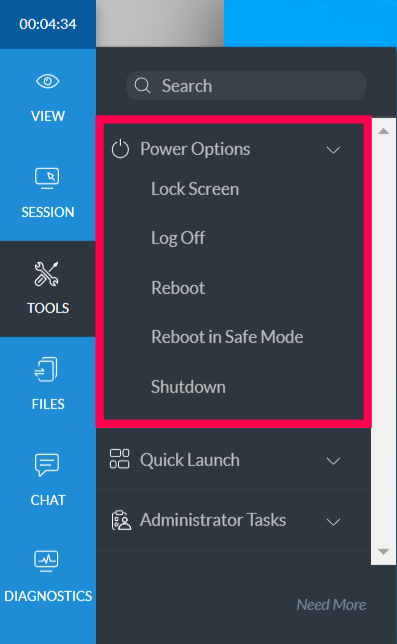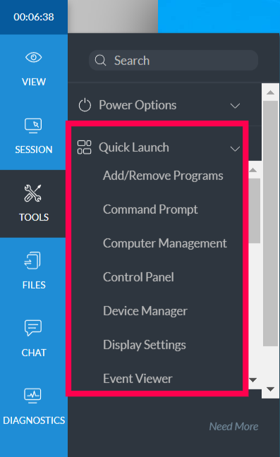 Quick Launch provides shortcuts to navigate through the remote computer quickly. You can manage files, uninstall software, access system tools, and more.