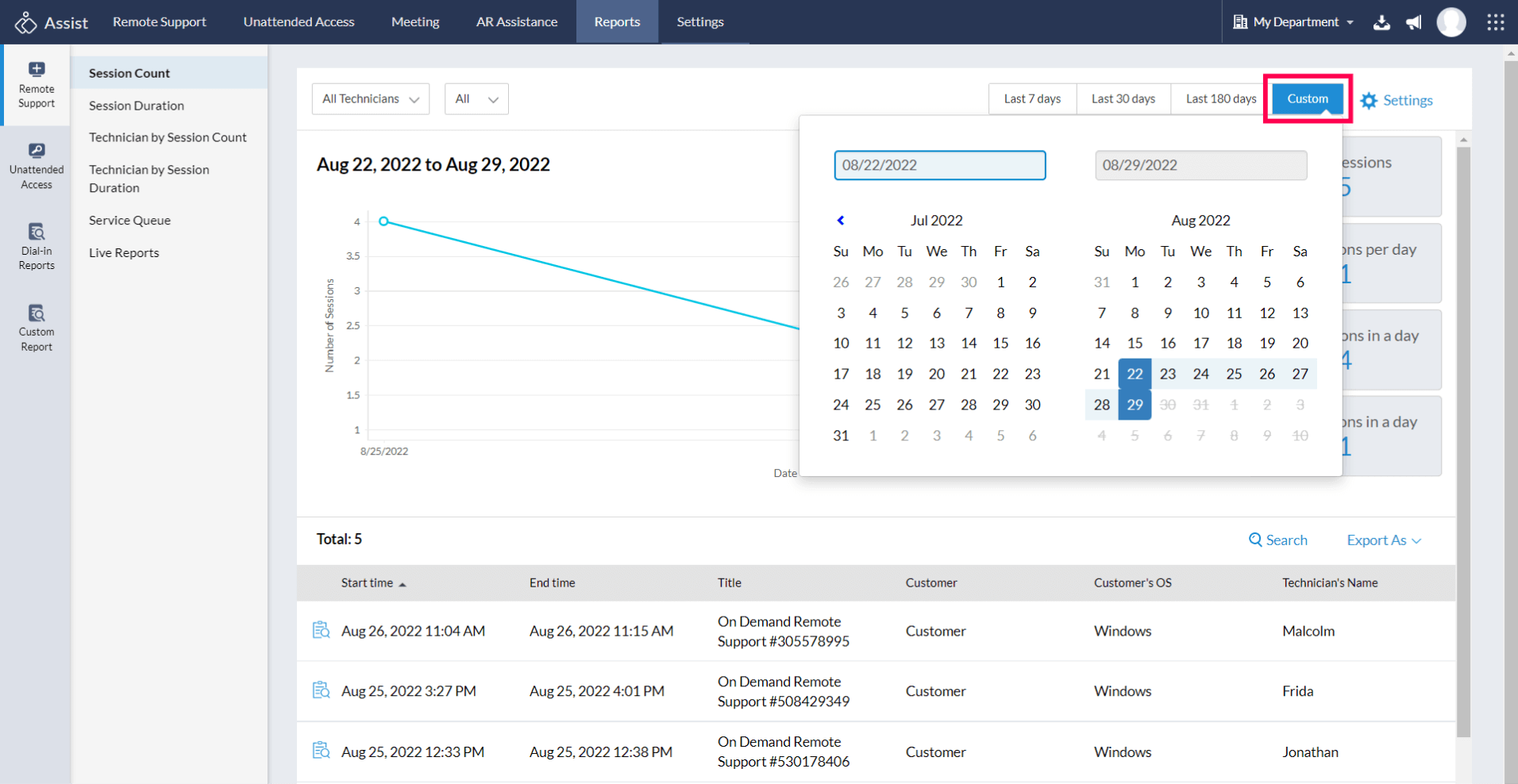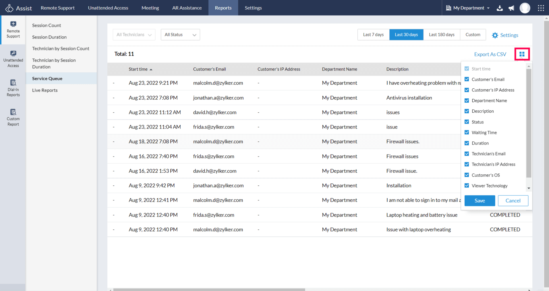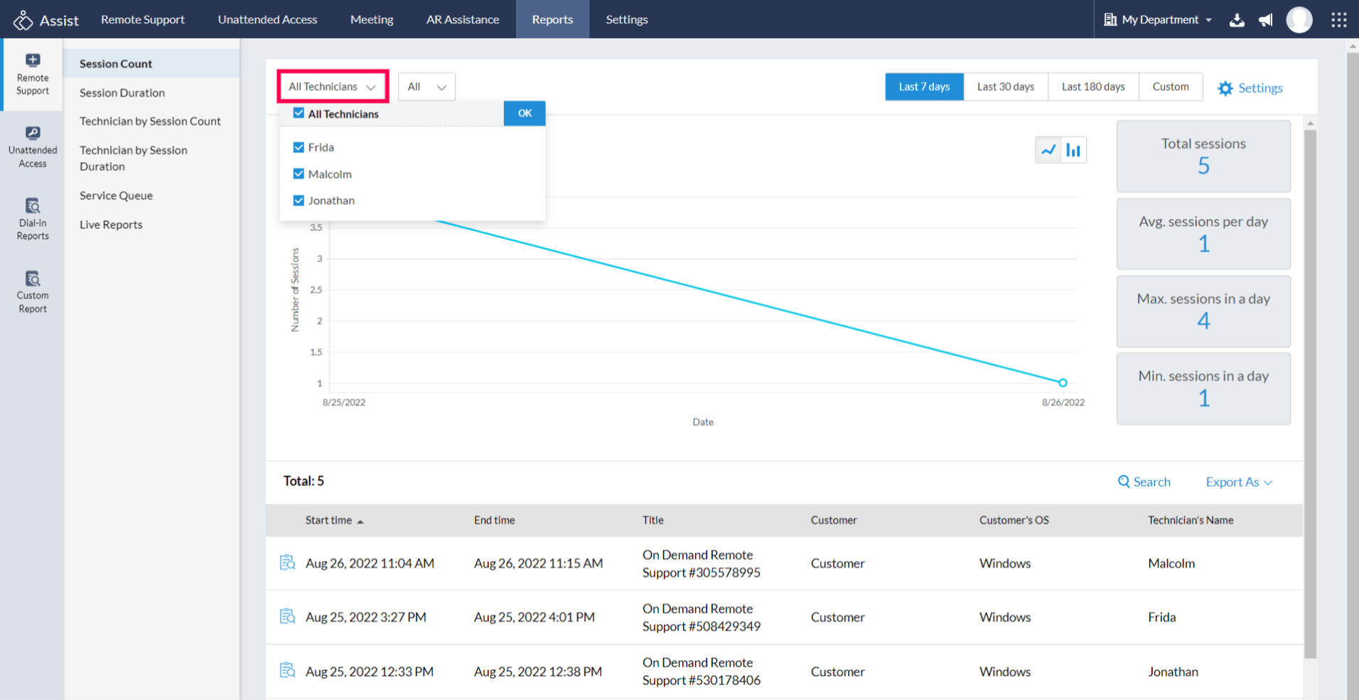 - Choose any one of the views segregated based on the session count, session duration, the technician and also view the status of your service queue requests from the left-hand sidebar.