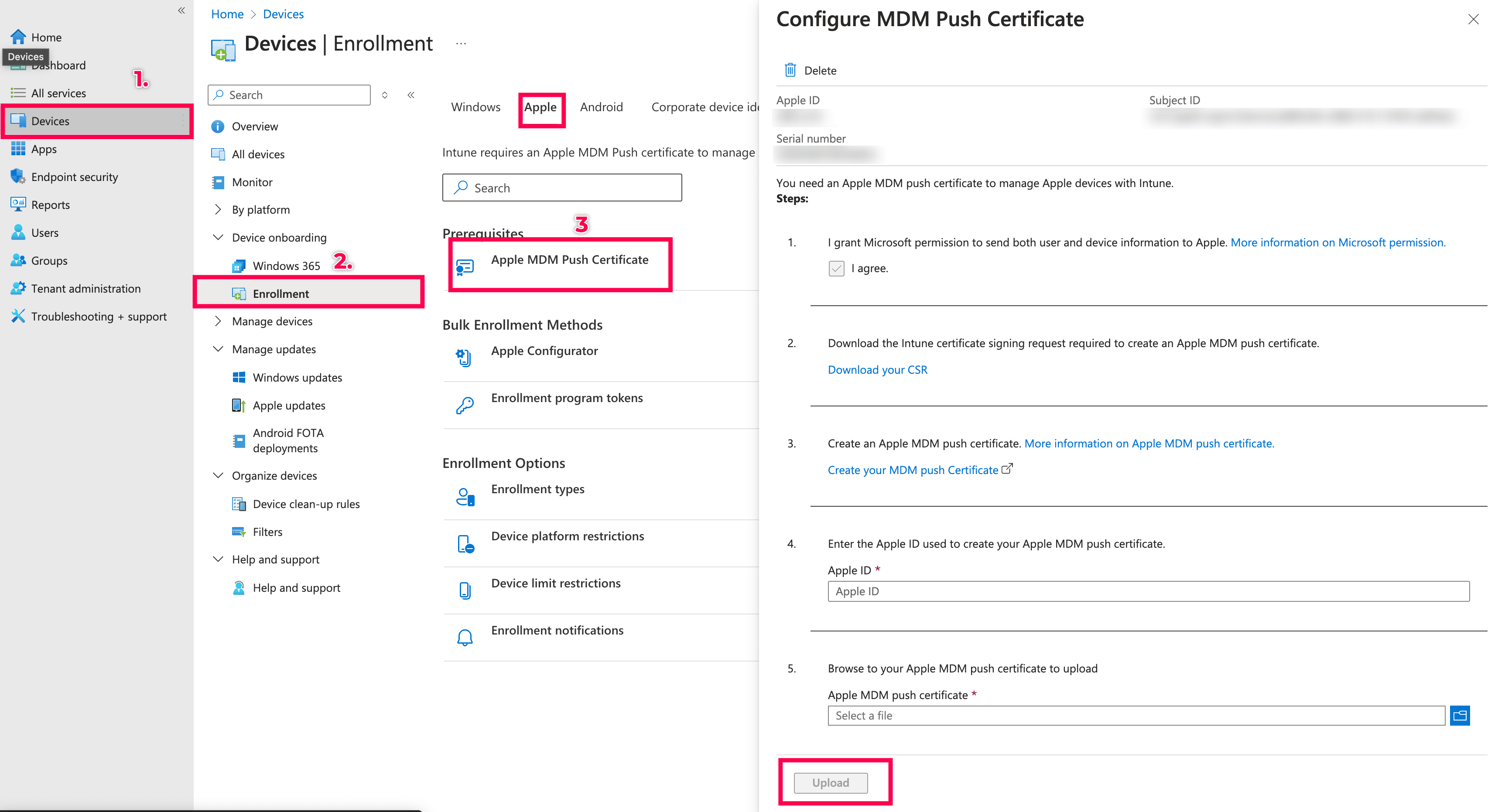 Navigate to Devices > Device Onboarding > Enrollment > Apple > Apple MDM Push Certificate and select the necessary permission to send both user and device information to Apple, enter the Apple ID, choose the Apple MDM Push Certificate, and click Upload to configure the MDM Push Certificate and complete the enrollment process.