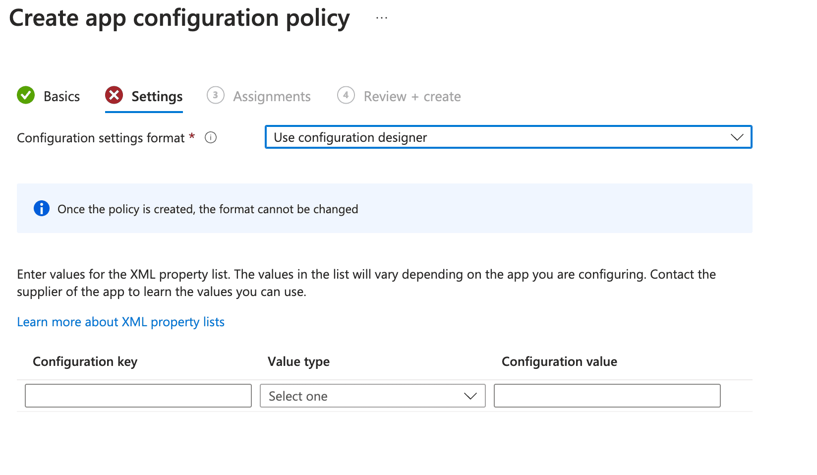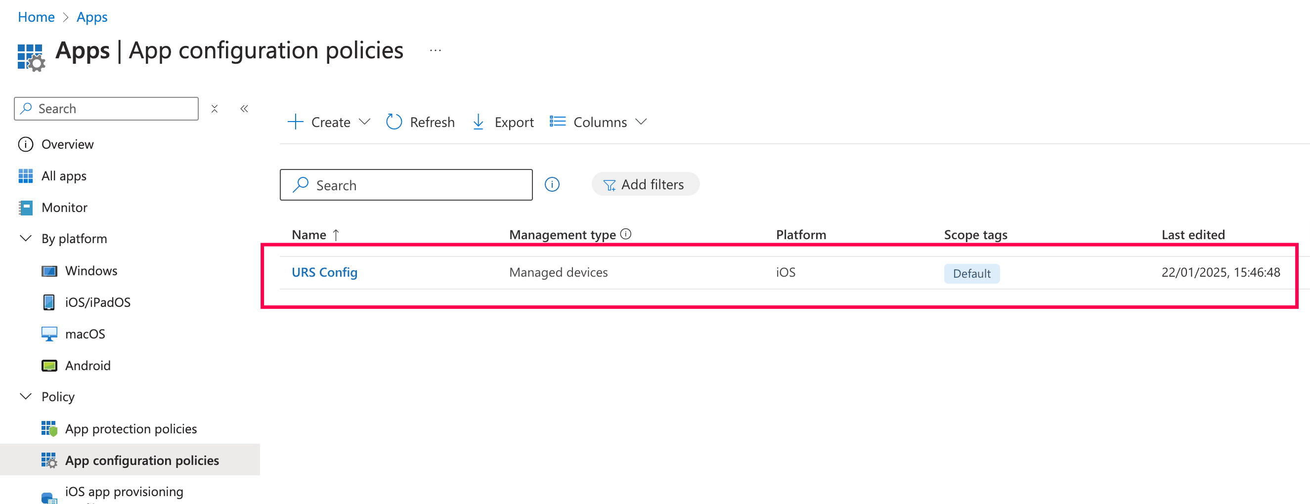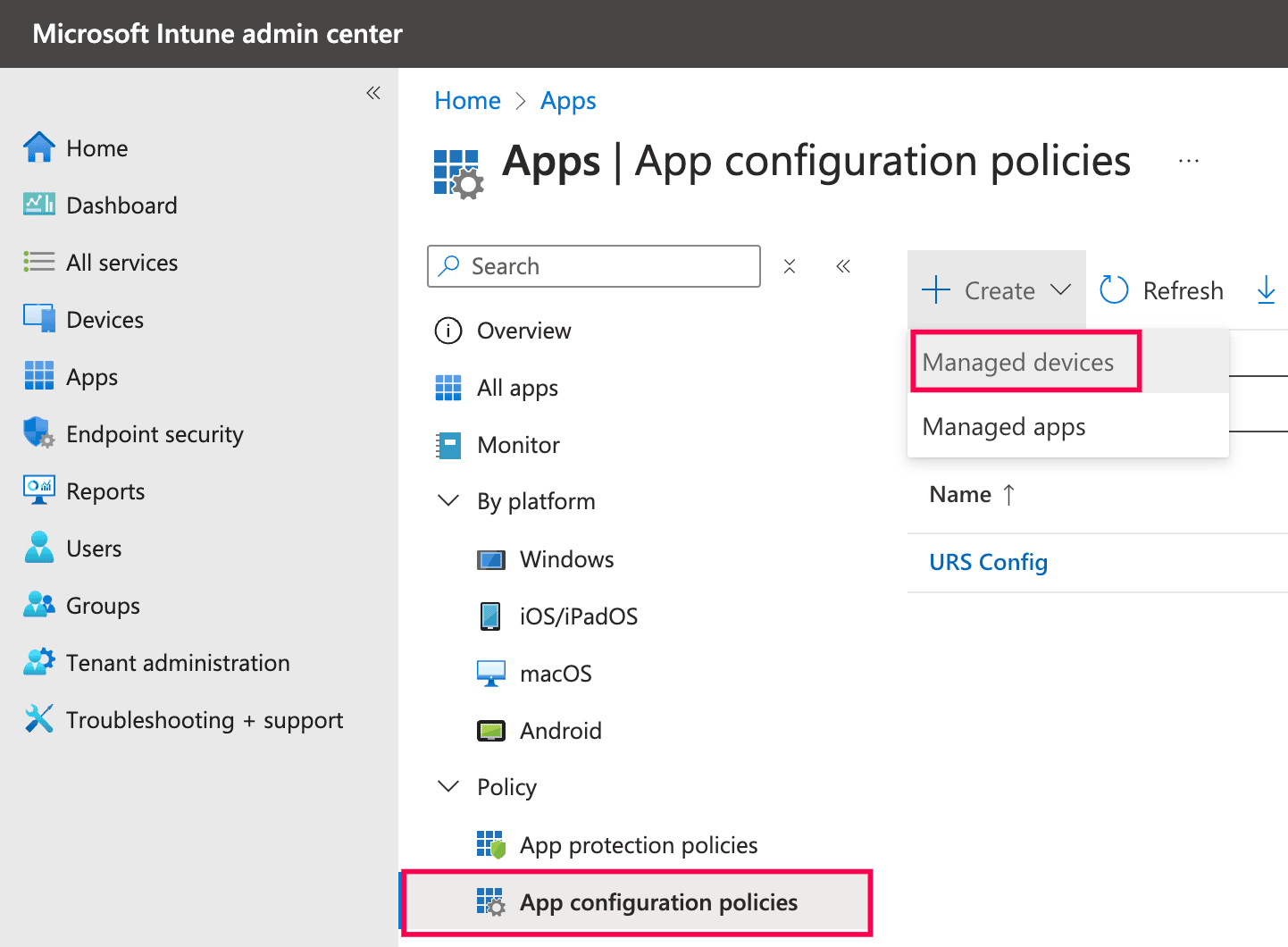 - Navigate to Apps > App Configuration Policies and tap + Create.