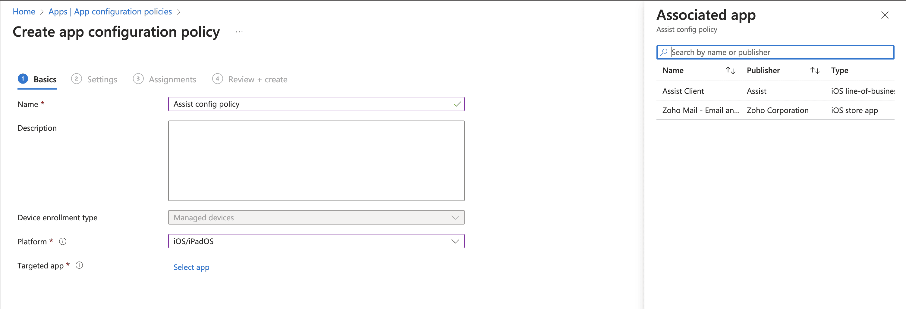 Enter a policy name, select the platform (iOS), and choose the app enrolled.