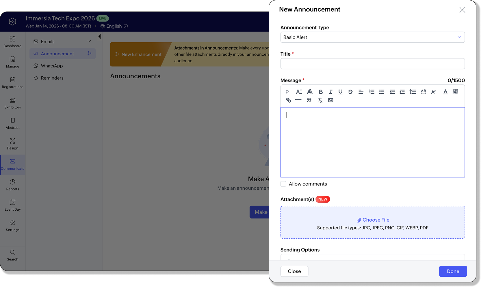 New FeatureKeep your attendees updated about changes in schedule, venue, agenda, or anything that's happening during the event.