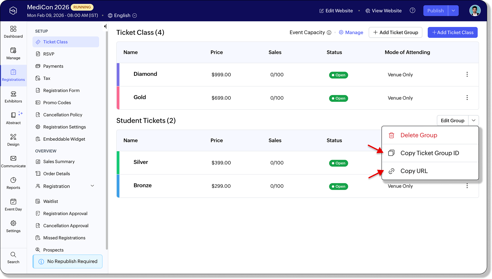 UpdatesCopy and share a ticket group URL to show only tickets from a specific group for targeted registrations. You can also copy the ticket group ID and use it with the embeddable widget to display only selected ticket groups on external websites.
