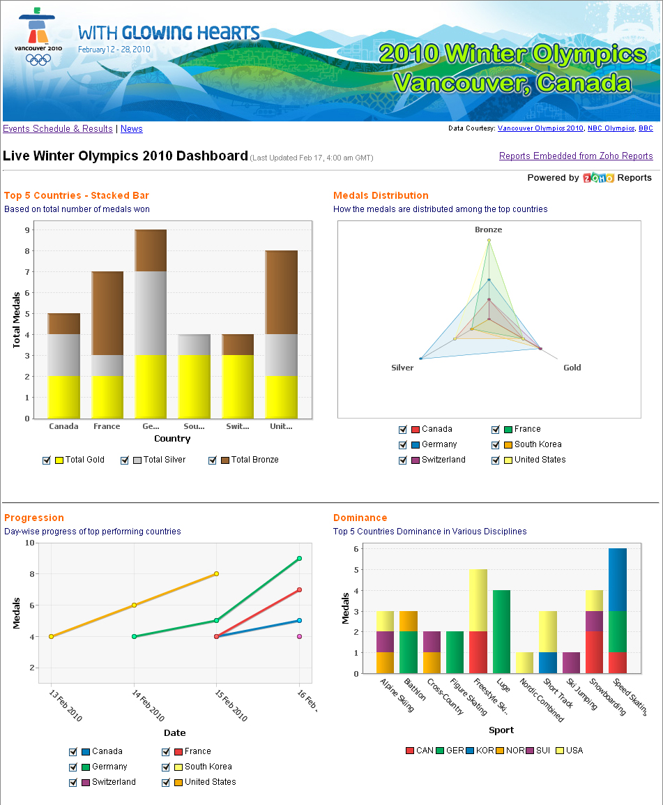 We had earlier made a live dashboard for the Beijing Summer Olympics 2008. A good many sports enthusiasts visited it and many of you had good things to say about it. For the ongoing Winter Olympics at Vancouver, Canada, we found there are a good many sites offering live updates with lots of cool info. However, a single page where you get to see the results and trends at a glance was lacking. So with that in mind, we collected information from different data sources and built a dashboard using Zoho Analytics. It is available at http://vancouver2010.wiki.zoho.com.