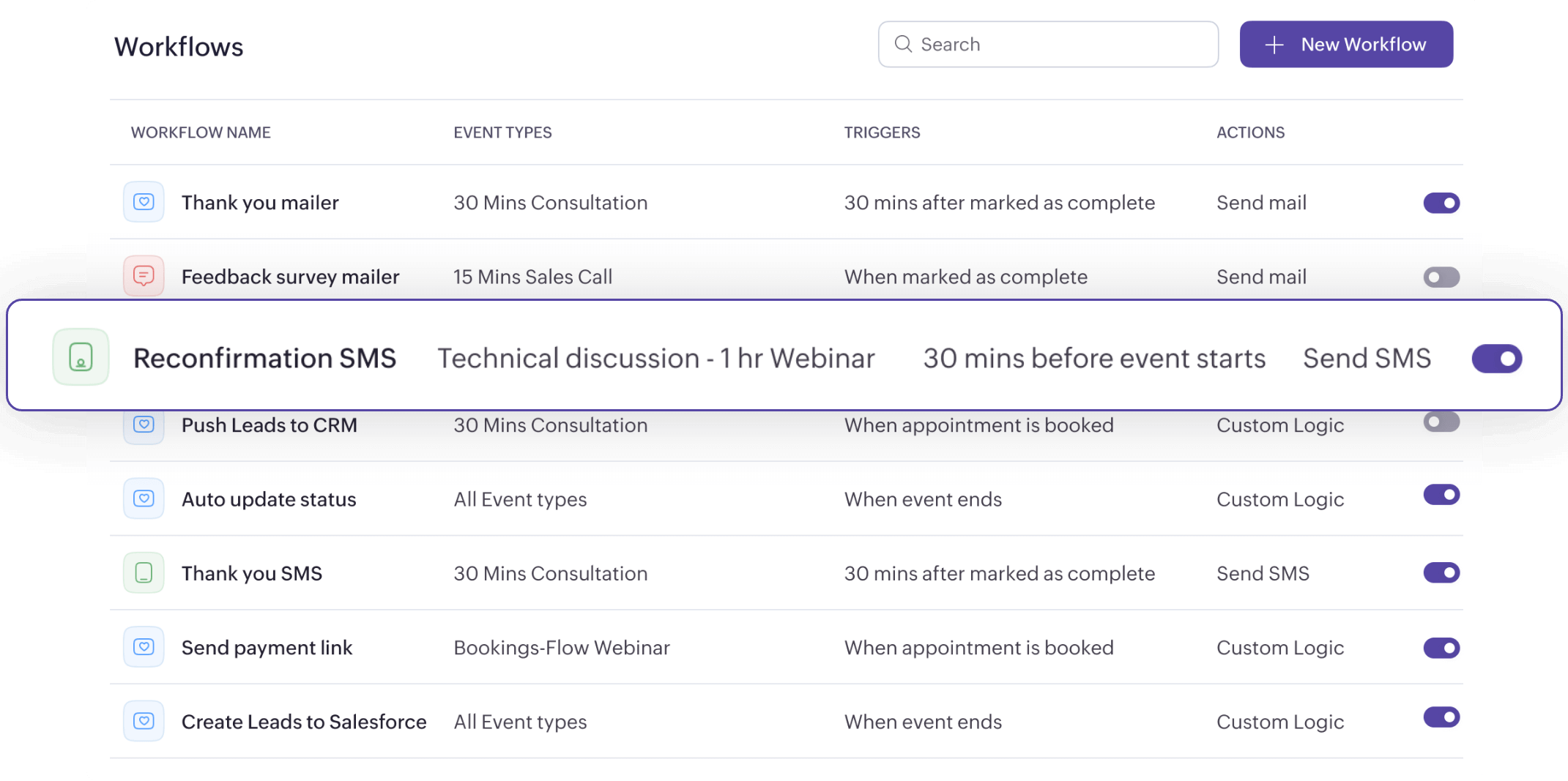 Zoho Bookings allows custom functions so you can customize notifications, implement scheduling triggers and workflows, add or update data in external software like your CRM tool, and set up a host of other functionalities for seamless integrations.