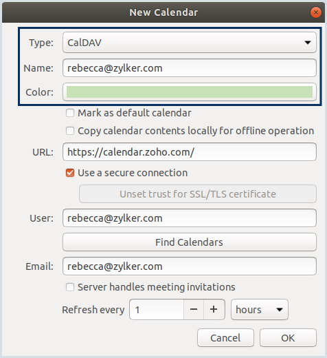 Enter the username (Eg: rebecca@zylker.com) and Location (the CalDAV URL you copied from this step) field and click Find Calendars.