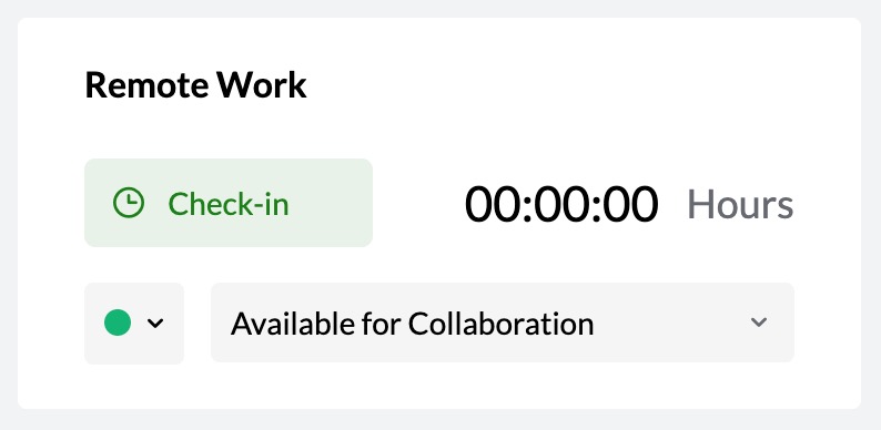 With the help of the Remote Work section in your user profile, you can check-in, check-out and manage your availability status right from your Calendar. The status of availability, check-in, and check-out will also reflect in other Zoho apps like Zoho People, Zoho Mail and Zoho Cliq, to name a few.