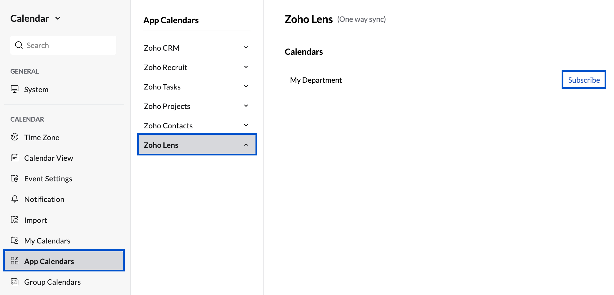 - All the Departments you have created in Zoho Lens will be available here. Click Subscribe next to the specific department you want to add to Zoho Calendar or click on Subscribe all to add all the department calendars.
