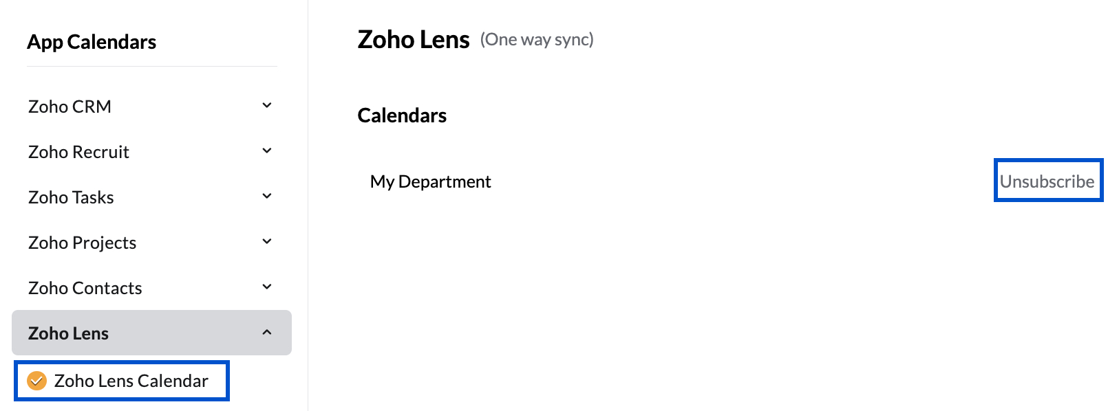 - Click Unsubscribe next to the department's calendar you wish to remove from Zoho Calendar or click on Unsubscribe all to remove all the Zoho Lens calendars from Zoho Calendar.