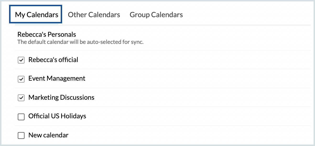 - In the My Calendars tab under CalDAV, the default calendar will be auto-selected for CalDAV sync. You can also select other personal calendars listed below in My Calendars for sync using CalDAV.
