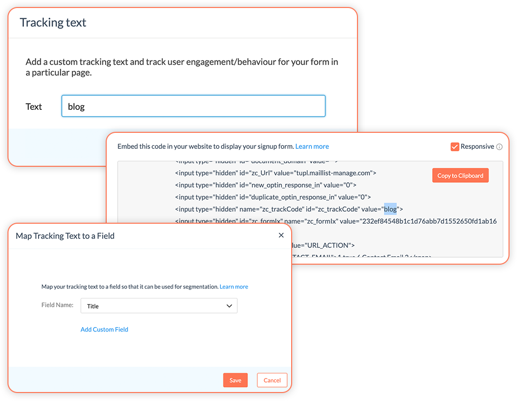 Zoho Campaigns gives you form tracking, so you know where your form is performing well. For example, if your signup form is embedded in multiple places on your site, you can see which forms are collecting the most emails and which ones are under performing. You can also map the tracking text to any of the fields, which will help you effectively segment and target your contacts.
