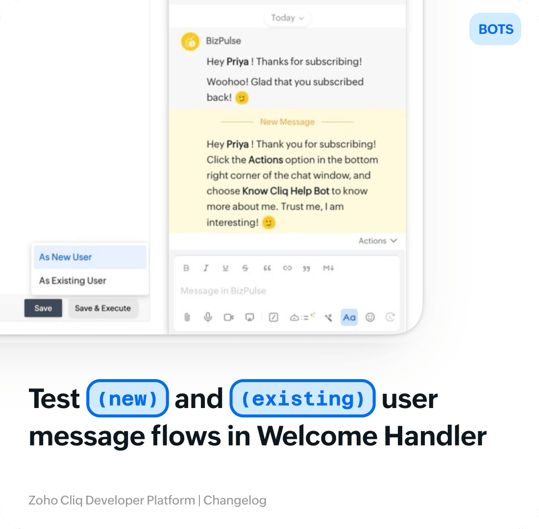 You can now simulate Welcome Handler responses for both new and existing users during trial runs. With this update, developers can explicitly choose the user type and verify both the onboarding and re-engagement flows.